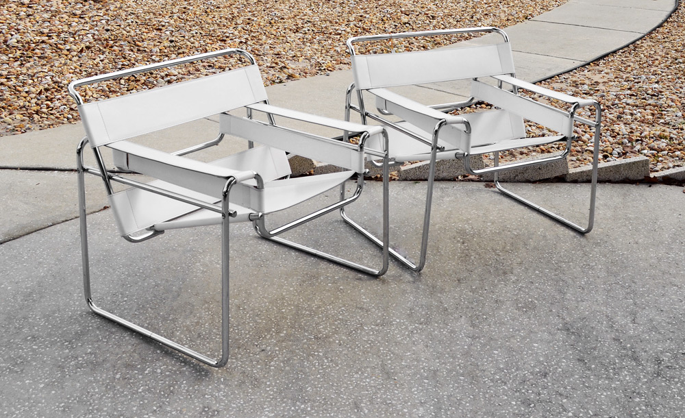 PAIR OF WASSILY CHAIRS: Bent chromed steel and white leather modernist style arm chairs designed by Marcel Breuer. Measures approx. 29''h. x 31'' x 26''.