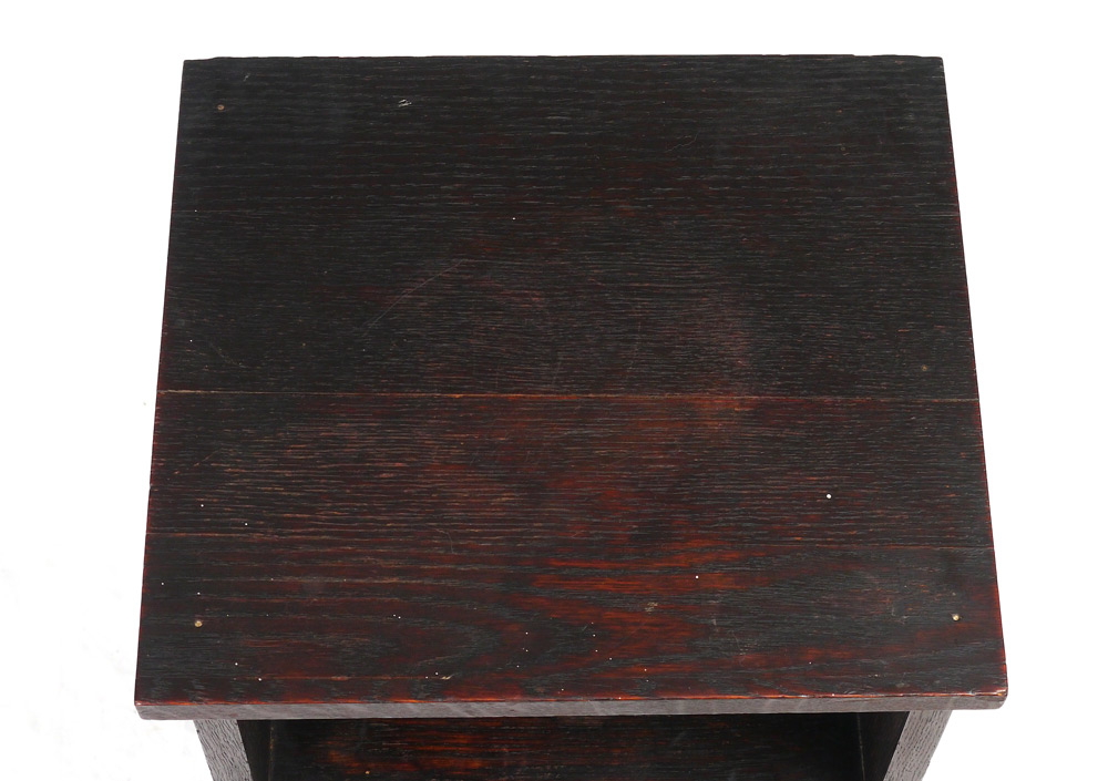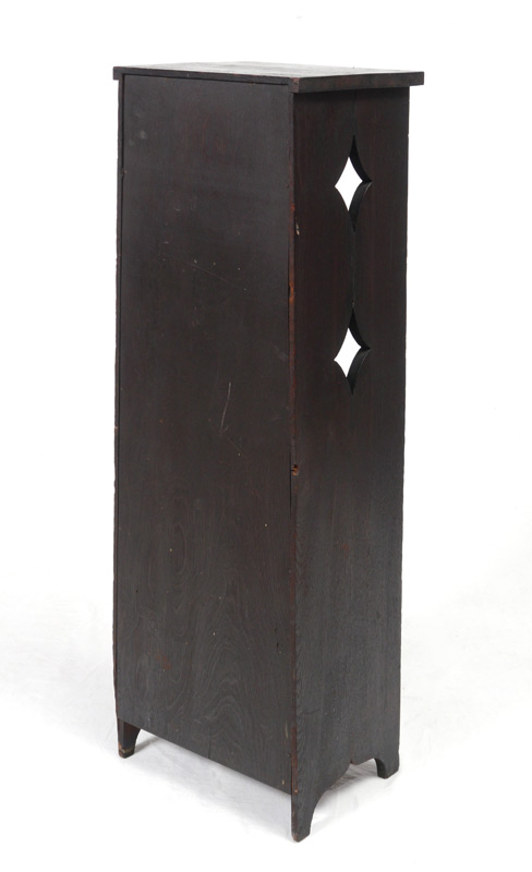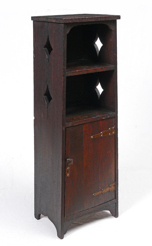 ARTS & CRAFTS BOOKSHELF: Diminutive book shelf with single shelf over single door, flared sides with diamond pattern windows. 43 1/4'' h. x 15'' x 12''.