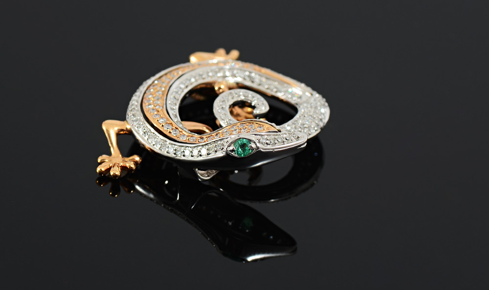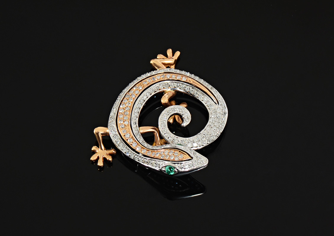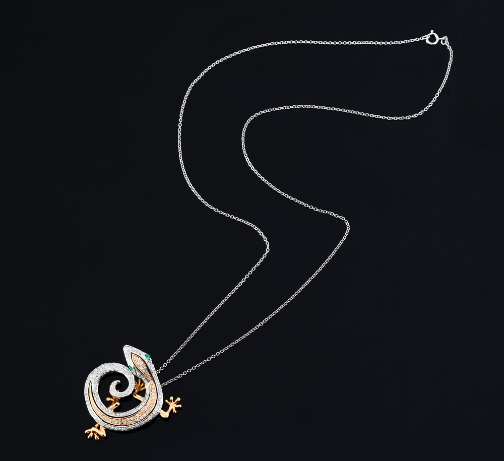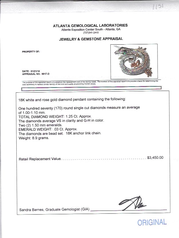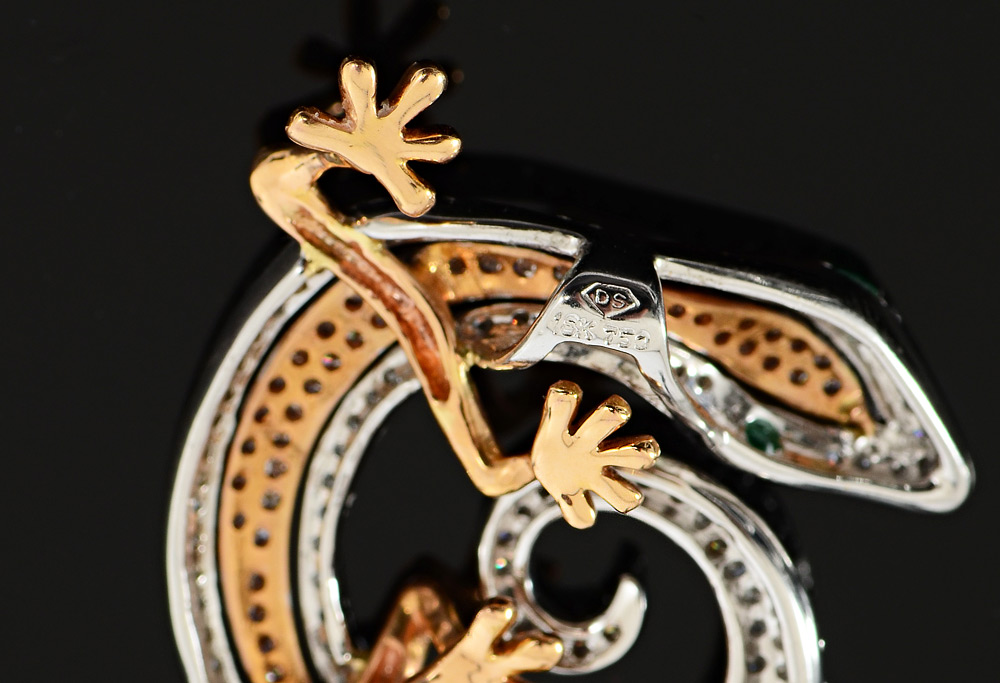 18K DIAMOND LIZARD PENDANT NECKLACE: A lifelike rendition in rose and white gold covered in 170 bead set, round single cut diamonds totaling approx. 1.25 Ct., averaging VS in clarity and G-H color. The eyes are emeralds. The 18K anchor link chain is 18''. Lizard dia. 1 1/8''. Signed DS. Weight 8.9 grams. Sold with current Atlanta Gemological GIA graduate's appraisal for $$3,450.