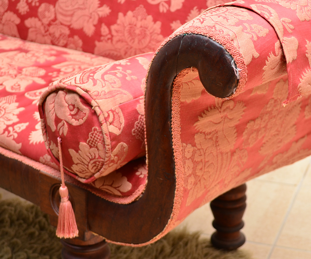 19TH CENTURY SCROLL ARM SOFA: Shaped back rail, scroll arms, turned legs on castors. Salmon upholstery with floral pattern. Overall 30 1/4'' h. x 80'' x 22''.