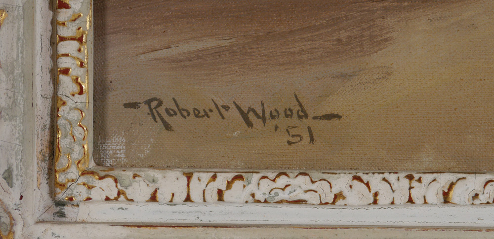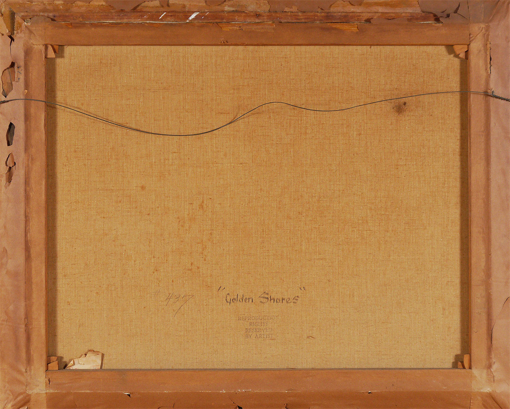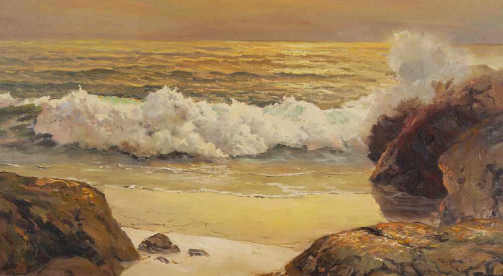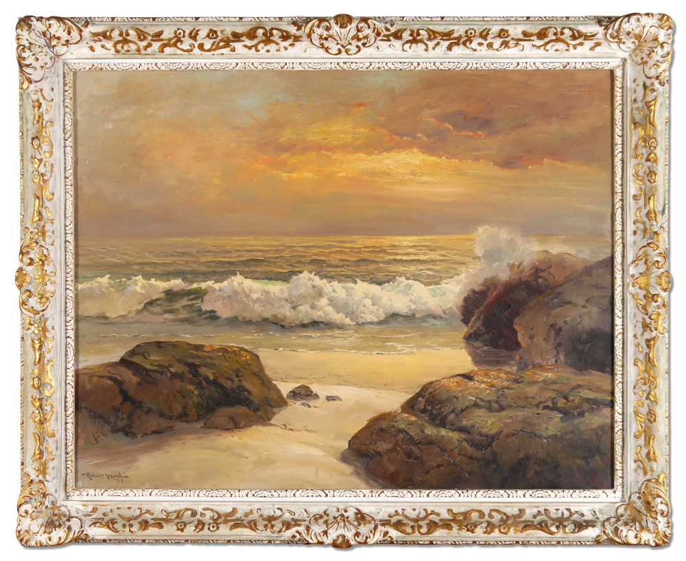 WOOD, Robert William, (American, 1889-1979): ''Golden Shores'', Surf Crashing on a Golden Sunset, 28'' x 36'', signed lower left, encased in a gilded carved and painted period frame 35'' x 42 3/4'', titled verso, dated '51.