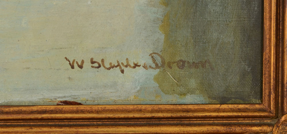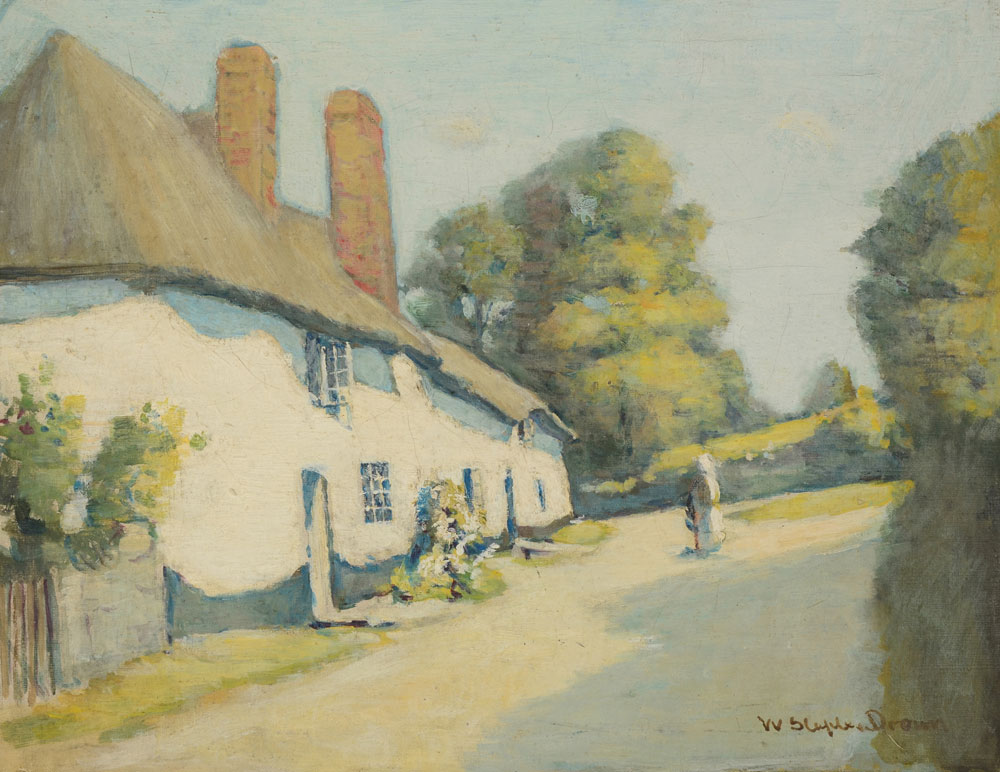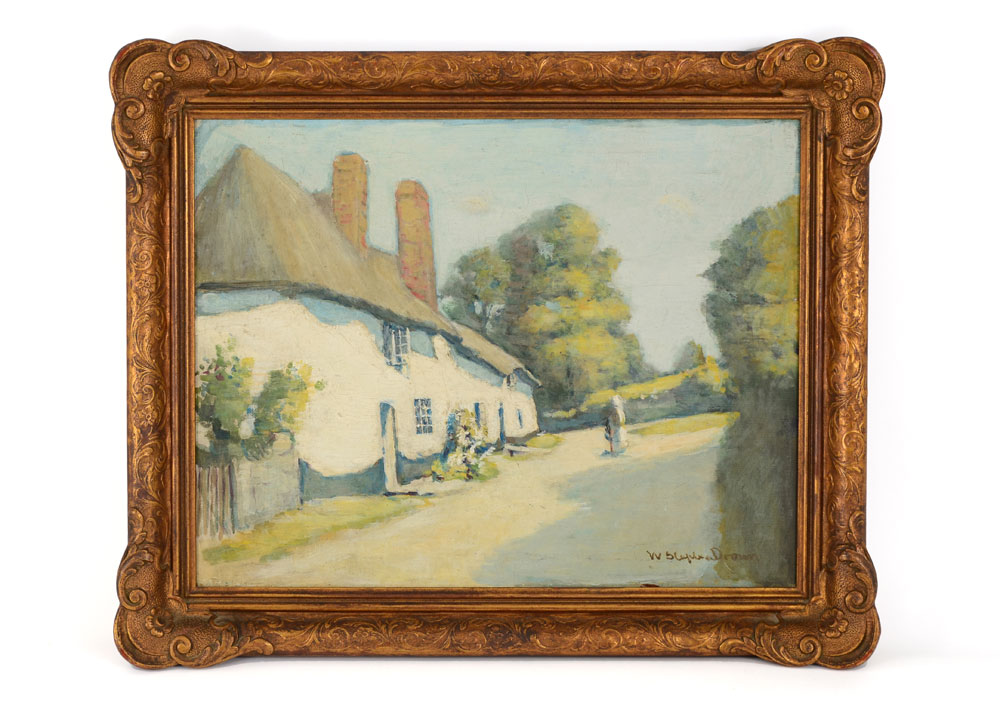 DROWN, William Staples, (American, 1856-1915): Country Cottage with Figure on a Dirt Road, Oil/Canvas, 14'' x 18'', signed lower right, encased in a carved and gilded foliate motif gesso frame 17 3/4'' x 21 3/4''.
