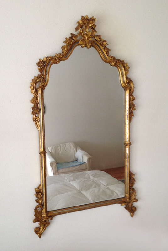CARVED GILT WOOD WALL MIRROR: Frame carved with floral and foliate scroll motifs, inset strips of mirror accents. Overall measures 52 1/2'' h. x 30'' x 2''.
