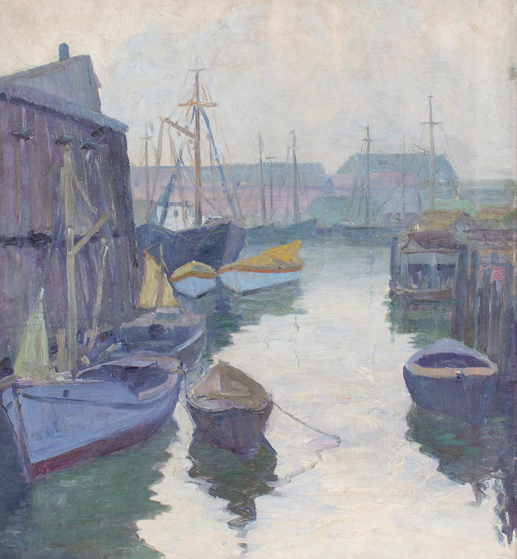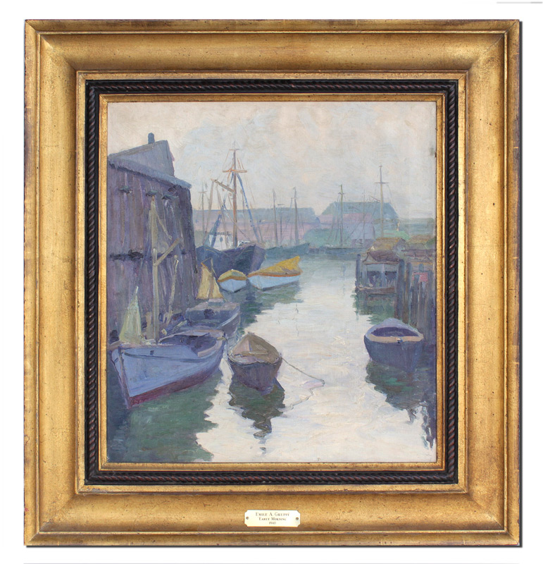 GRUPPE, Emile Albert, (American, 1896-1978): ''Early Morning, Rockport Harbor'', Oil/Canvas, 20'' x 18 1/8'', no visible signature, later gold frame 28 1/4'' x 26 1/2'', this was formerly sold in a James D. Julia sale for $5,000.