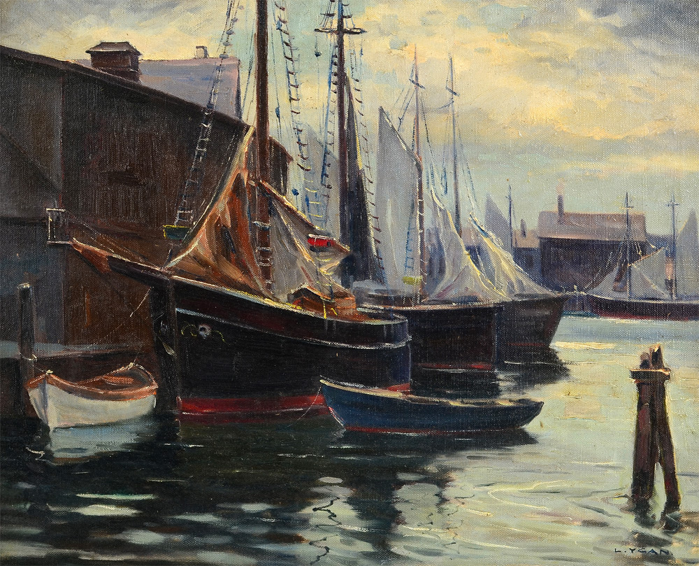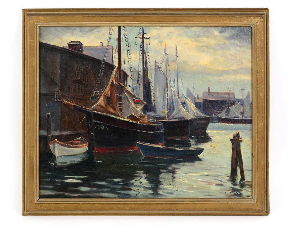 DE NAGY, Laszlo, (Hungarian-American, 1906-1944): Gloucester Harbor Scene, Oil/Canvas, 16'' x 20'', signed lower right L. Ygan, period frame with minor wear 19 1/4'' x 23 1/4''.