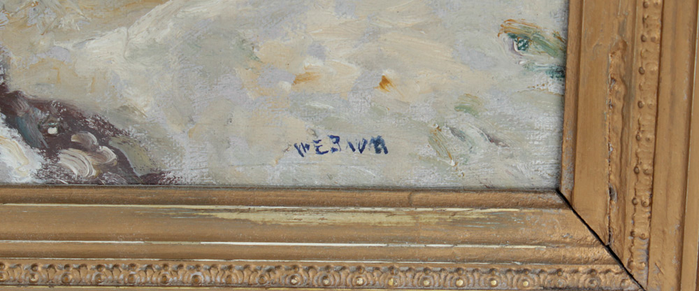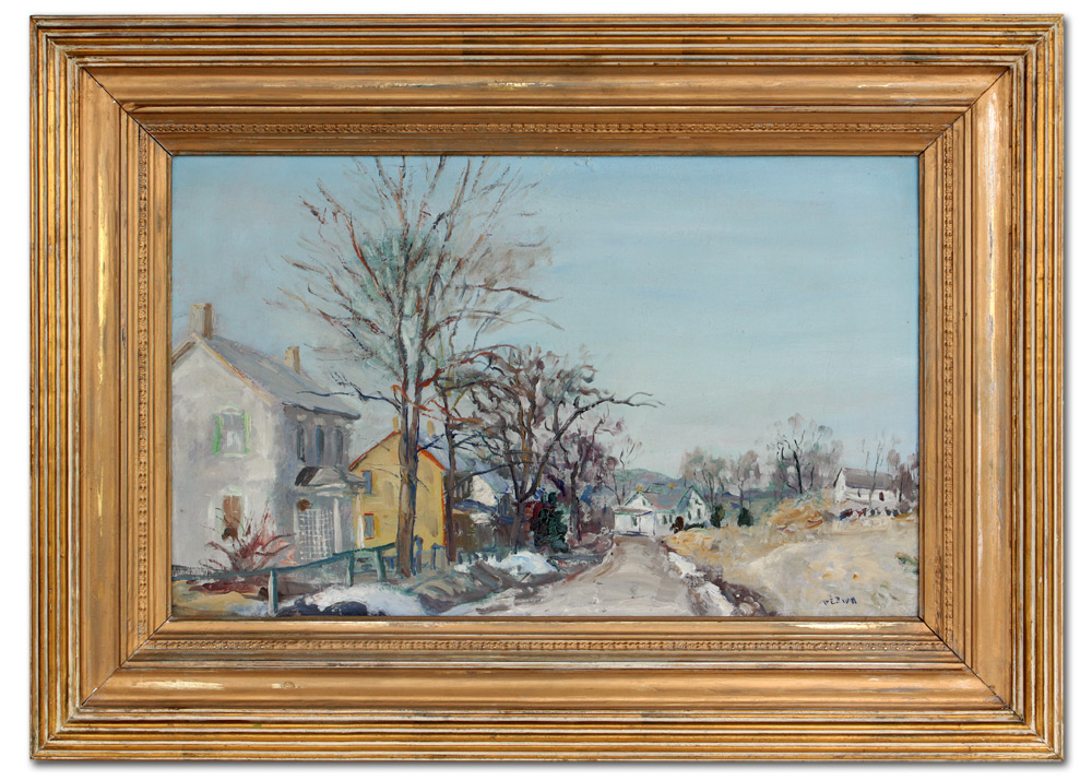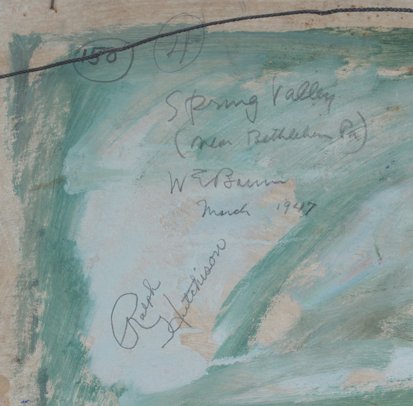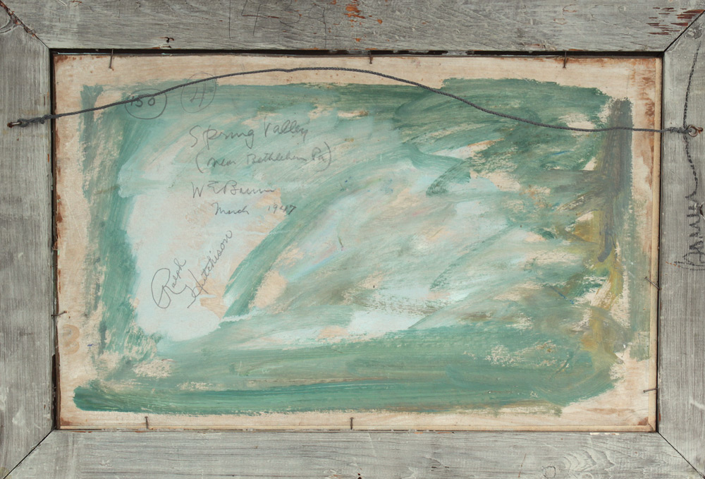 BAUM, Walter Emerson, (American, 1884-1956): ''Spring Valley'' (Near Bethlehem, Pennsylvania), Oil/Canvasboard, 12'' x 19 1/8'', signed lower right, signed and titled verso, dated 1947, period framing with minor wear 18 1/4'' x 25 1/2''.