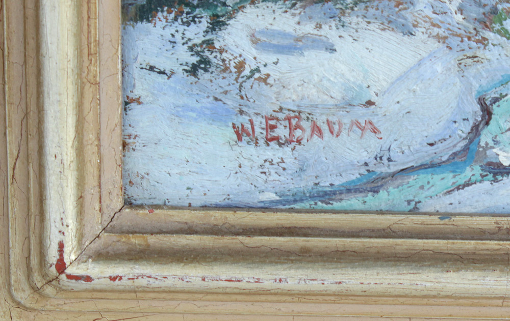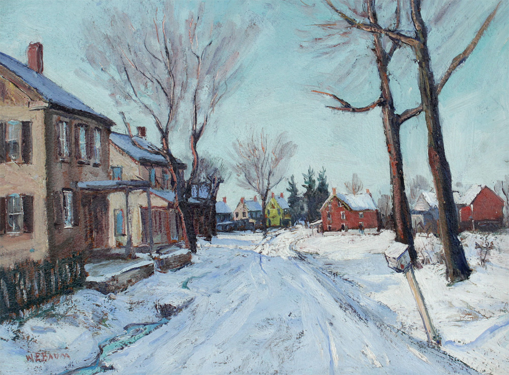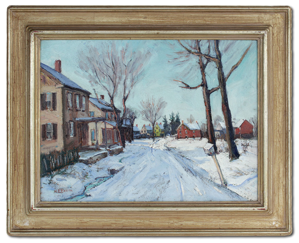 BAUM, Walter Emerson, (American, 1884-1956): ''Bucks County Village'', Oil/Board, 12'' x 16'', signed lower left, signed and tilted verso, encased in a vintage carved and painted frame with minor wear 16 1/2'' x 20 5/8''.