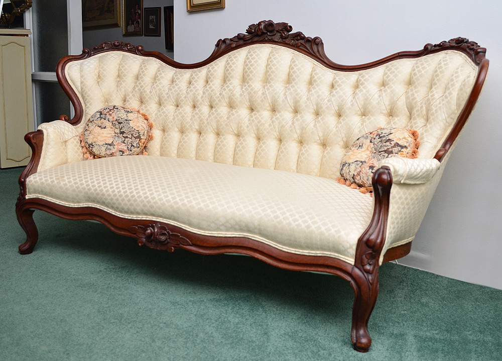 VICTORIAN CARVED SOFA: Carved crest with floral designs, shaped arms. Padded armrests, carved and shaped hand holds, supports, skirt with center floral decoration, shaped front legs. White patterned upholstery with tufted back. Overall measures 40 1/4'' h. x 77 3/4'' x 29 1/2''.