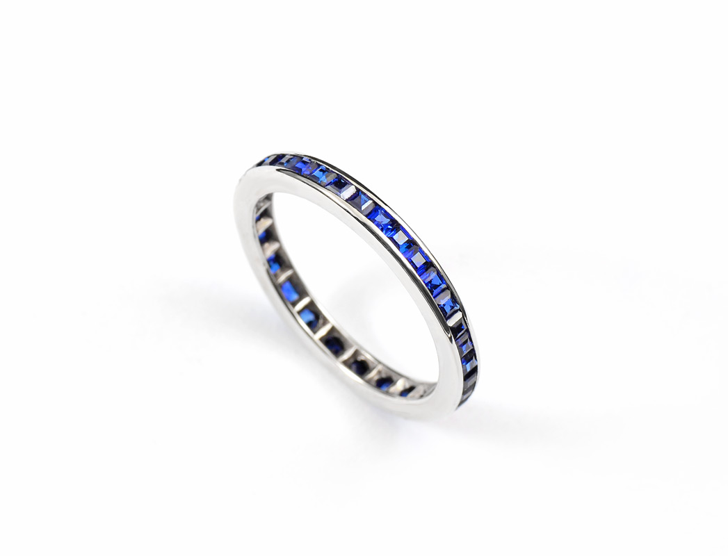 SAPPHIRE ETERNITY BAND RING: 14K white gold ring set with sapphires totaling approx. 1.14 Ct. Size 5.5. Weight 1.7 grams.