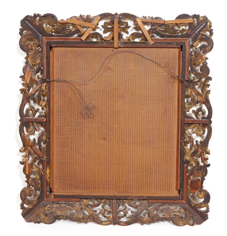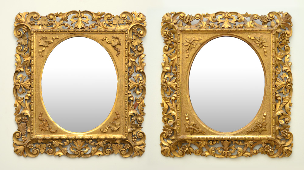 PR 19TH C GILT CARVED WOOD PARLOR MIRRORS: Pierced carved gilt wood frames of exceptional detail, 33 1/2'' h. x 30'' x 1 3/4'', opening 21 1/2'' x 16 7/8''.
