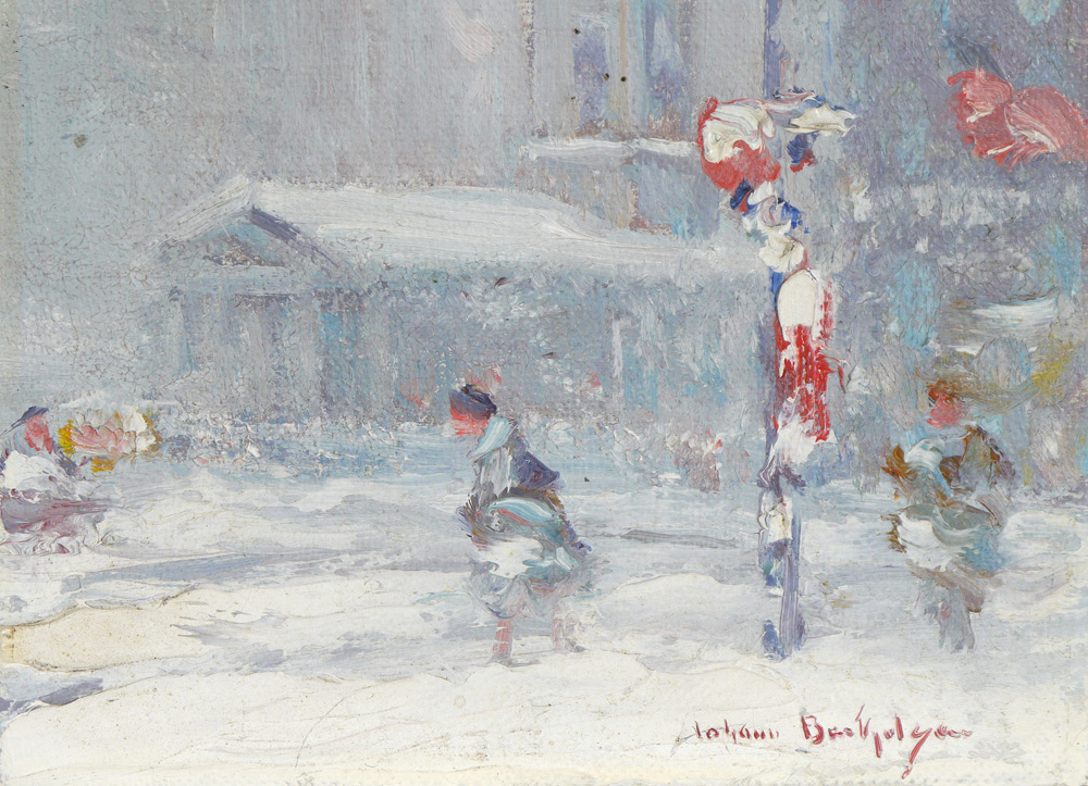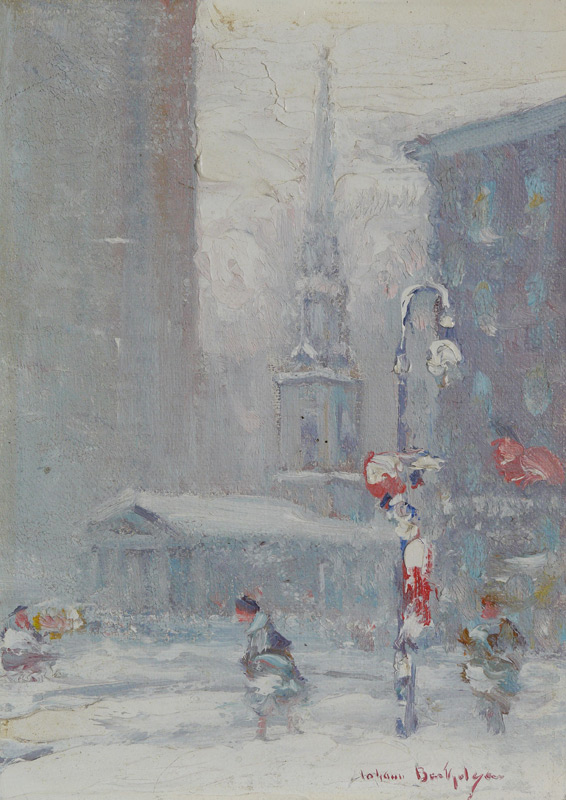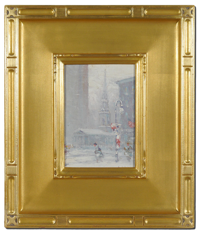 BERTHELSEN, Johann, (Danish-American, 1883-1972): St. Paul's Church in Winter, NYC, Oil/Canvasboard, 7'' x 5'', signed lower right, encased in a fine gilded and carved impressionist frame with Summit frame stamp verso 14'' x 12''.
