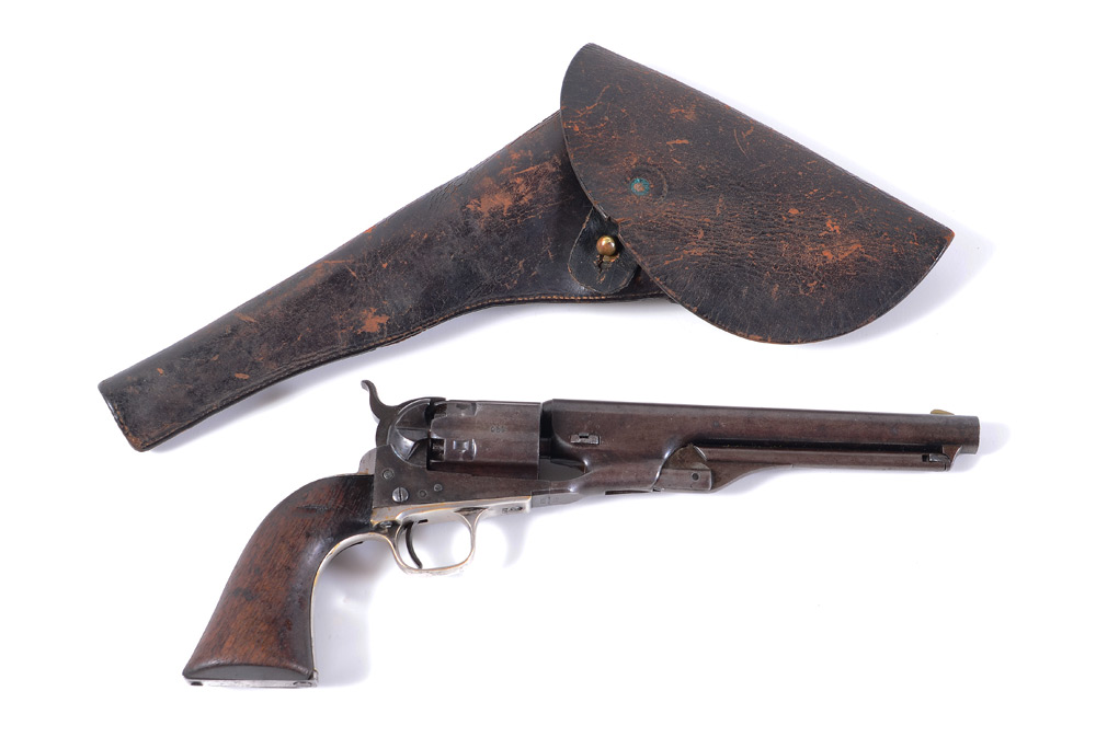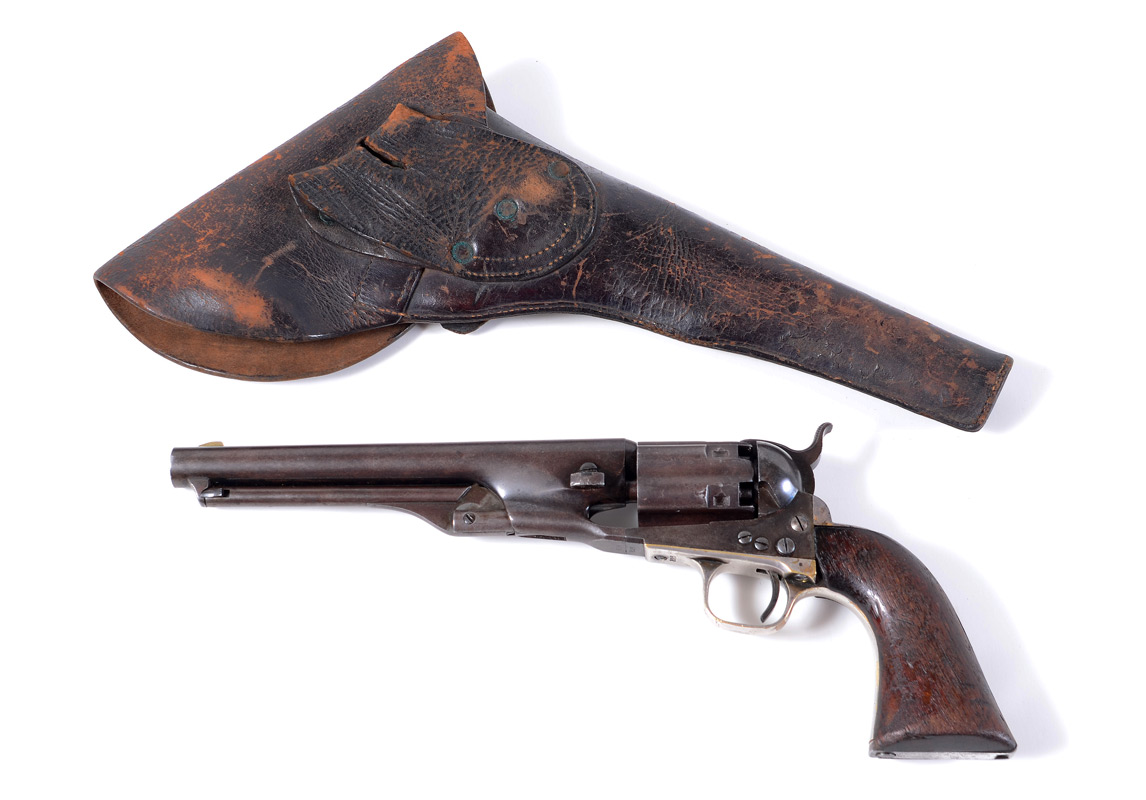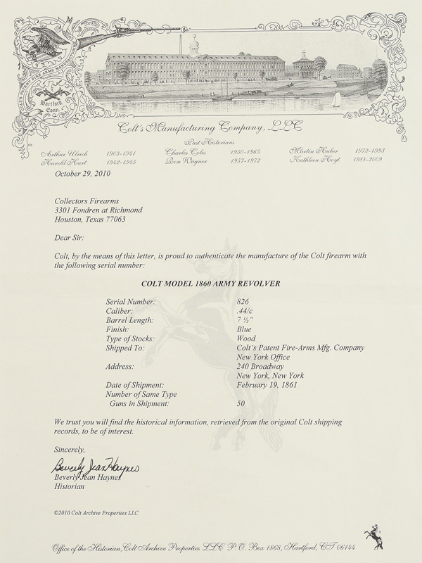 CIVIL WAR ERA COLT 1860 FLUTED ARMY REVOLVER: .44 caliber 7 1/2'' barrel, all matching serial numbers 826, Hartford address on barrel, shipped from factory on Feb. 19th, 1861. Overall chocolate brown patina, wood grips, nickel finish to guard and straps. Tight action currently functions fine. Sold with original J. Cummings, Springfield leather holster, and factory letter from Colt.