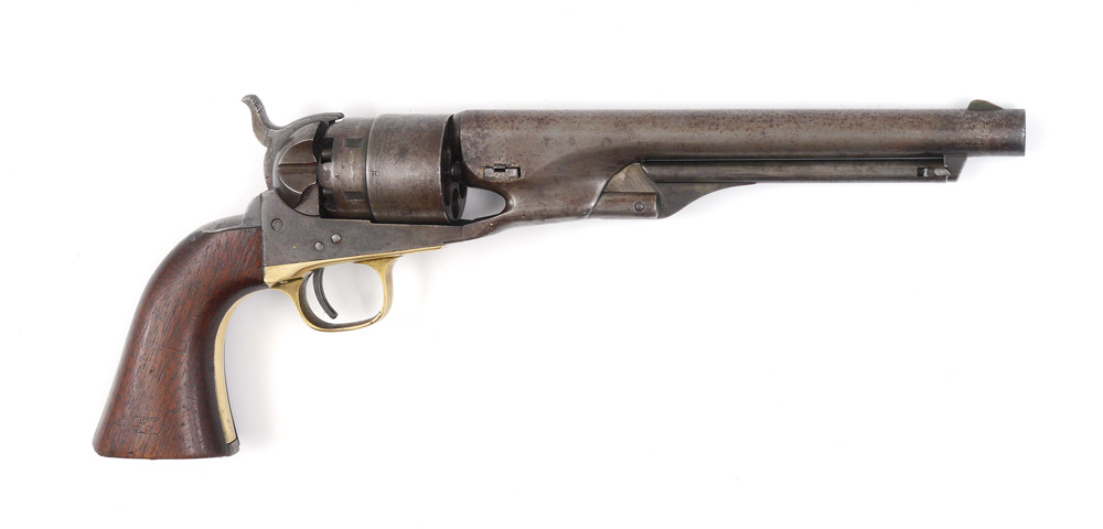 CIVIL WAR ERA 1860 COLT ARMY REVOLVER: .44 caliber 8'' barrel with New York address, all matching serial numbers 115841. Overall grey patina with some staining, nice visible cylinder scene. Brass trigger guard, steel backstrap. Martial cartouch JT on walnut grip, other stampings on various metal parts. Tight action currently functions fine. 13 1/2'' overall.