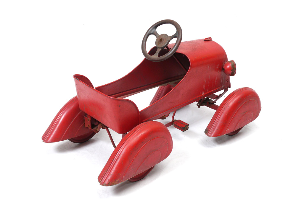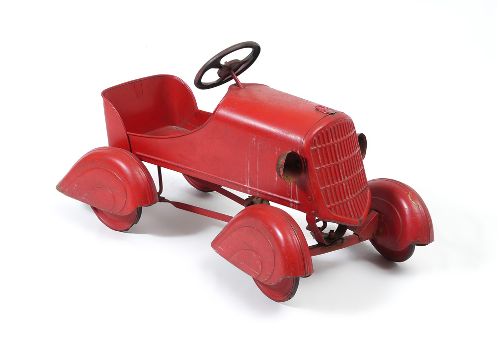 1930'S STEELCRAFT SPORT ROADSTER PEDAL CAR: Original 1930's model 510, old red paint overall. Rare model for this time period, measures 22'' h. x 35'' x 17 1/2''.