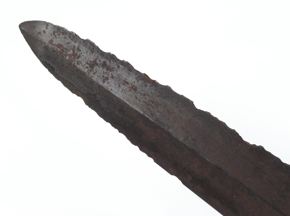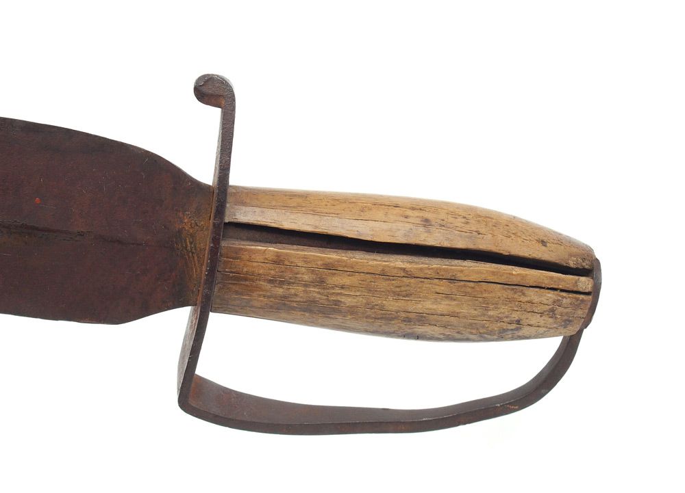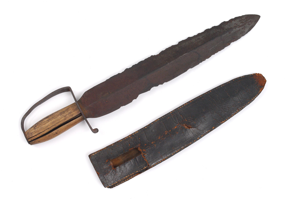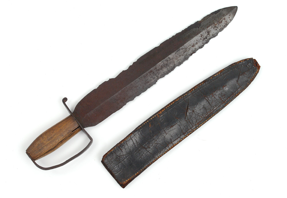 CONFEDERATE D GUARD BOWIE KNIFE: Wood grip D guard hilt with 15'' spear point blade in as found condition. Sold with leather sheath. Overall 19 1/2'' long.