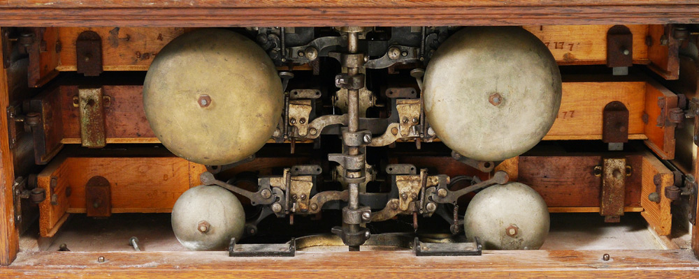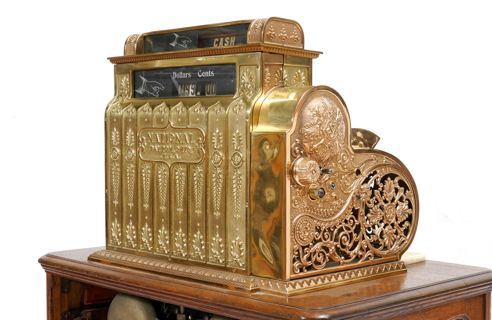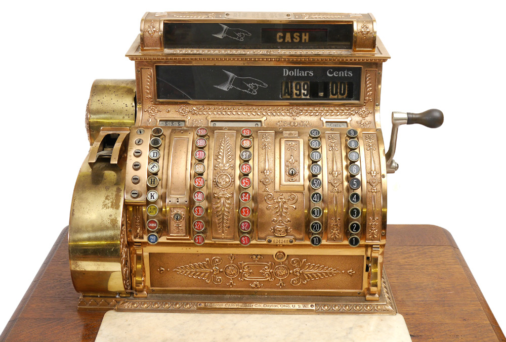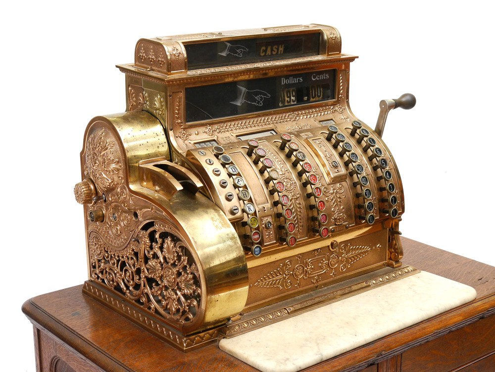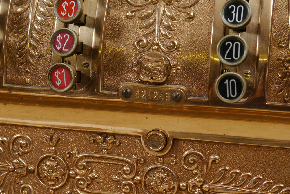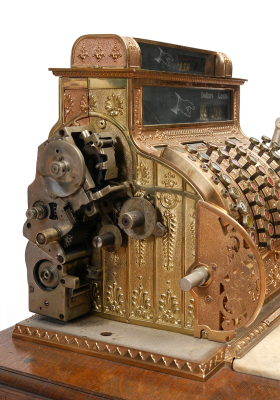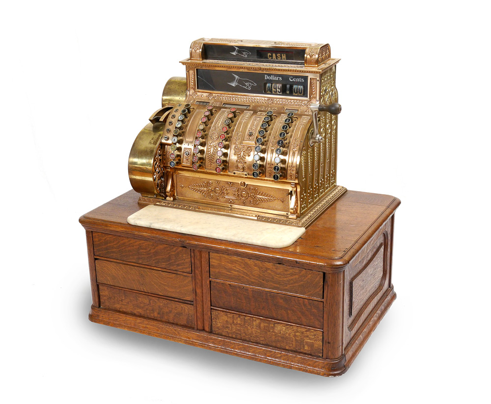 BRASS 6 DOOR NATIONAL CASH REGISTER: Circa 1905, serial number 424246, Empire pattern brass case, crank mechanism, 1 cent to $90 keys. 6 drawer oak base. Overall measures 29 1/2'' x 30 1/2'' x 21''.