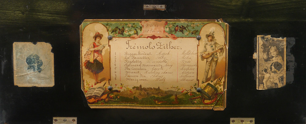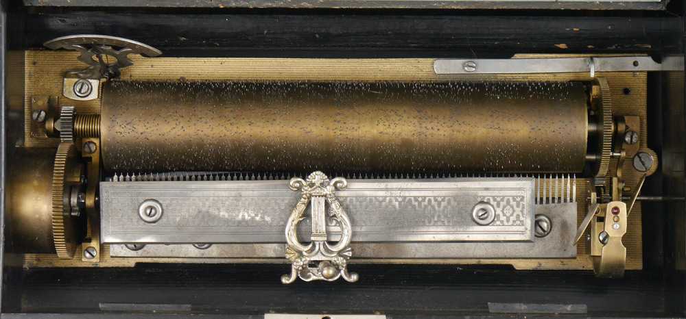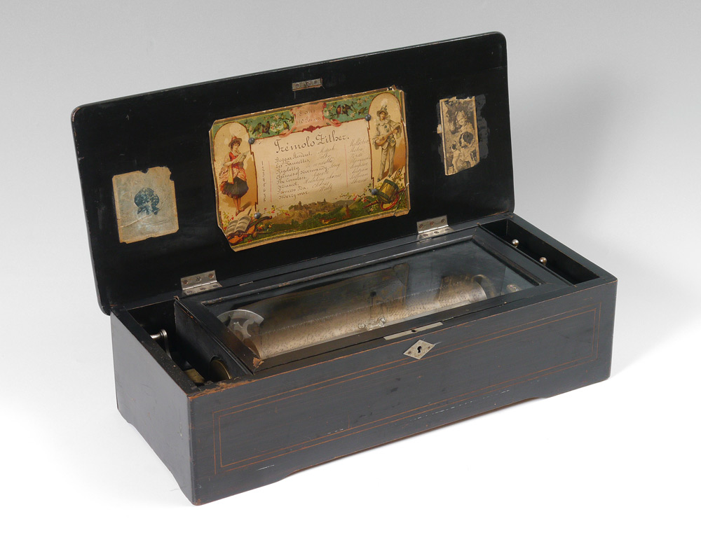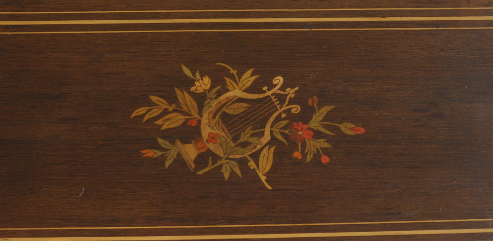 SWISS INLAID CYLINDER ROLL MUSIC BOX: Case with string inlay, marquetry musical instrument and flowers on hinged lid. Unmarked single comb movement plays 8 songs. Original lithograph with song listings under lid. Overall measures 6'' h. x 20 3/4'' x 9''.