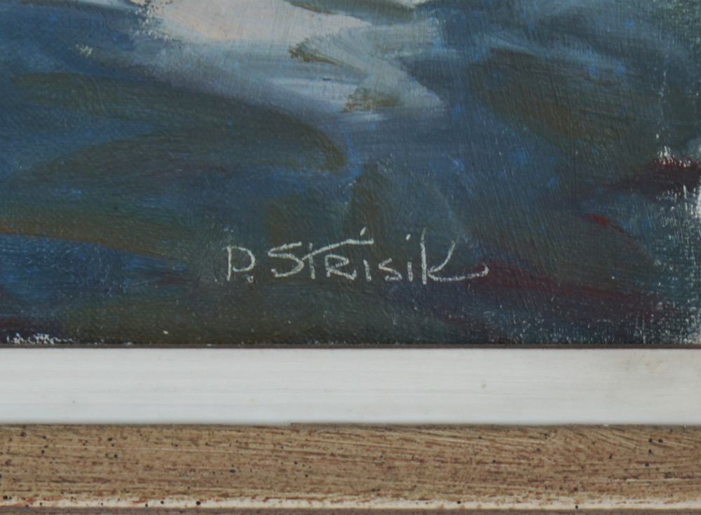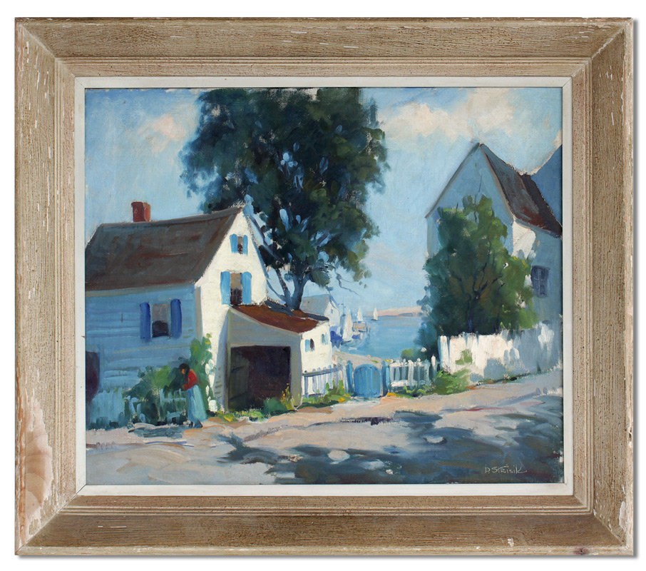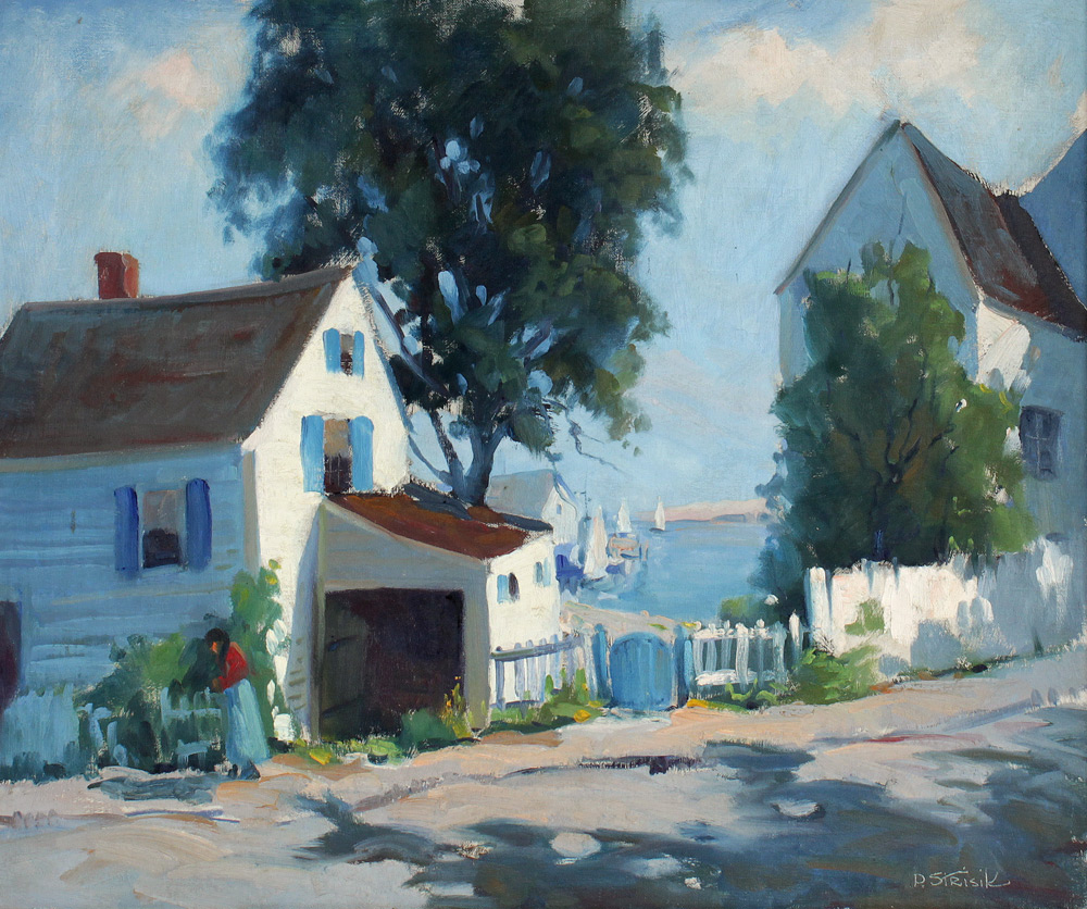 STRISIK, Paul, (American, 1918-1998): Rockport Street Scene, probably Pigeon Cove, Oil/Canvas, 20'' x 24'', signed lower right, original frame with wear 24'' x 30''.