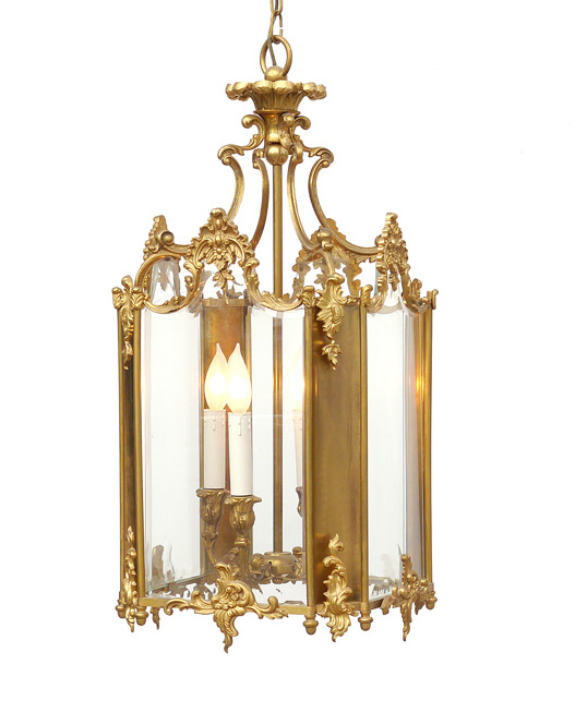 GILT BRONZE HANGING LANTERN: Foliate motif gilt bronze frame with rounded brass corner panels, beveled glass side panels. 4 socket electric fixture. Overall measures 29'' h. x 13 1/4'' x 13 1/4''. See matching lantern next lot 1228.