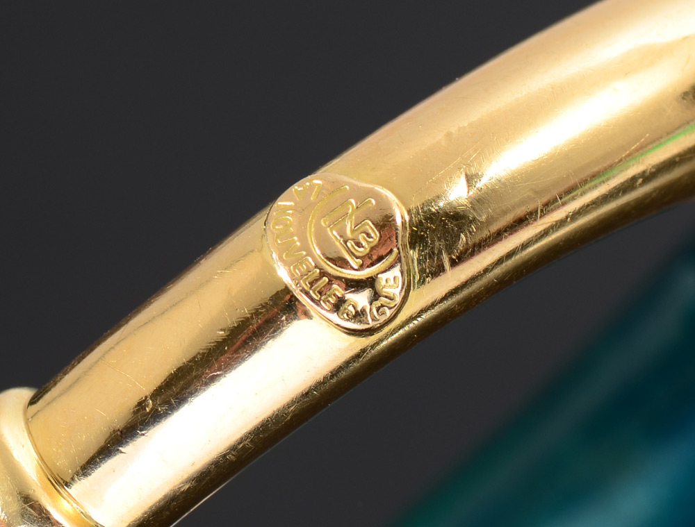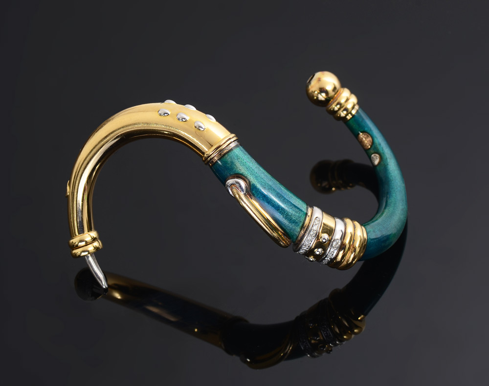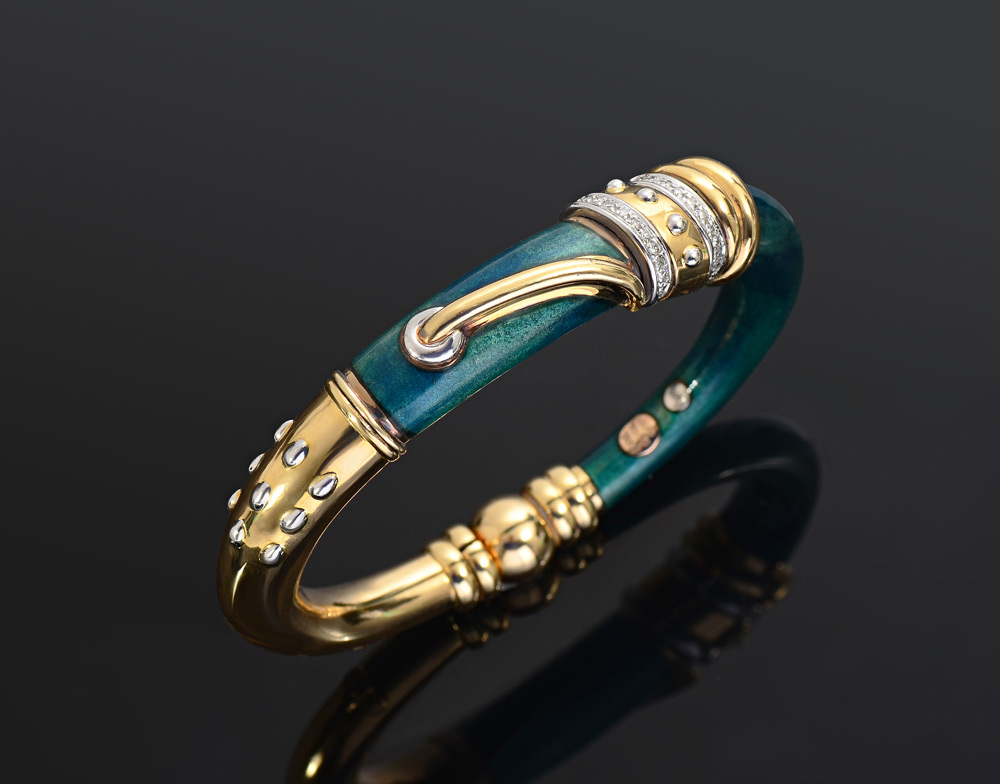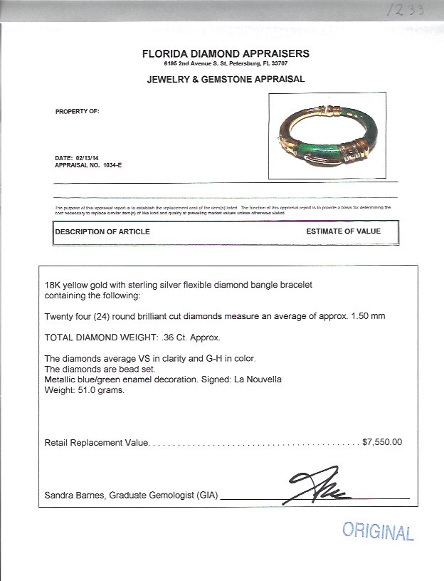 LA NOUVELLE ENAMELED GOLD DIAMOND BANGLE BRACELET: 18K yellow gold, sterling bangle bracelet with metallic blue/green enamel and embellished with 24 round brilliant diamonds totaling approx. .36 Ct., averaging VS clarity and G-H color. Signed La Nouvelle. Weight 51.0 grams. Sold with current Florida Diamond Appraisers GIA graduates appraisal for $7,550.