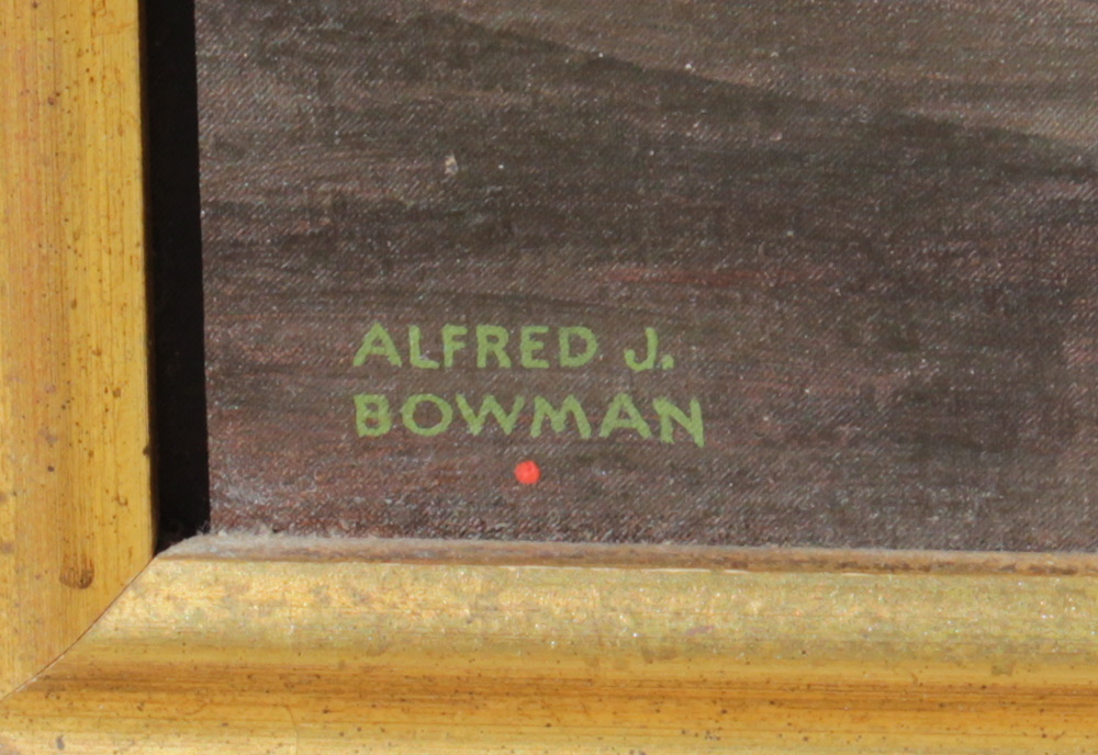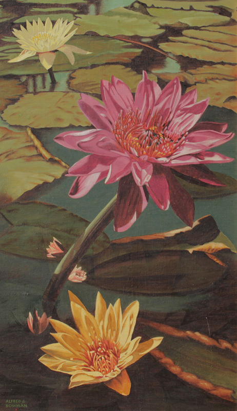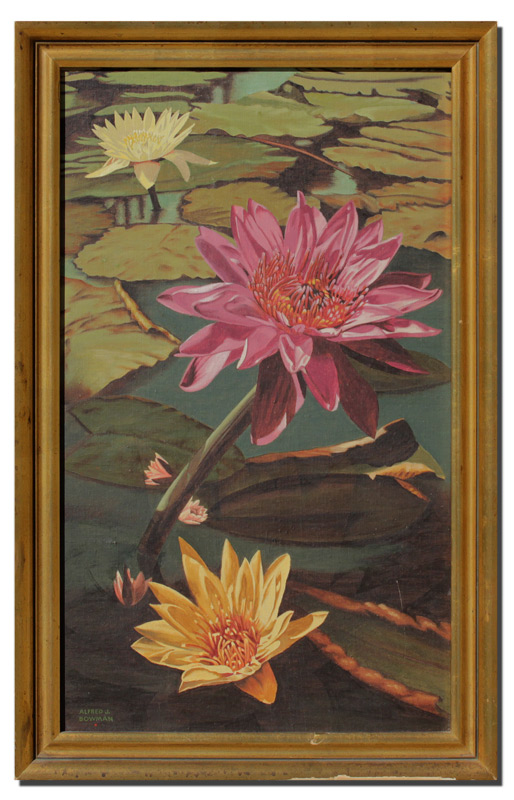 BOWMAN, Alfred John, (American, 1881-1842): Water Lilies, Oil/Canvas on board, 23'' x 13 3/4'', signed lower left, painted gold wood frame with wear 25 3/4'' x 16 1/4''.