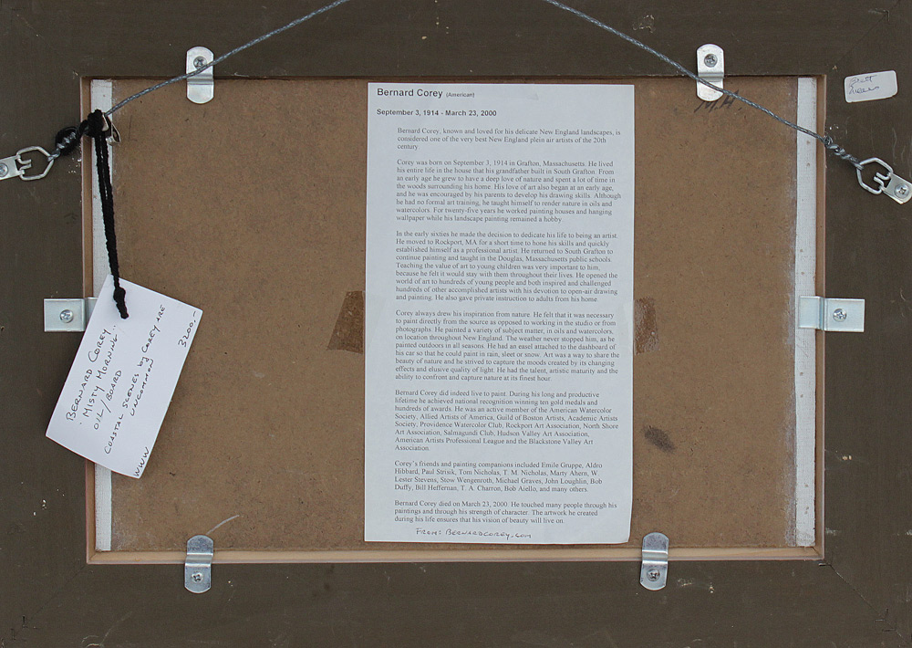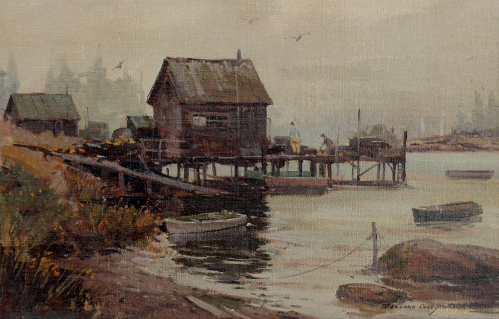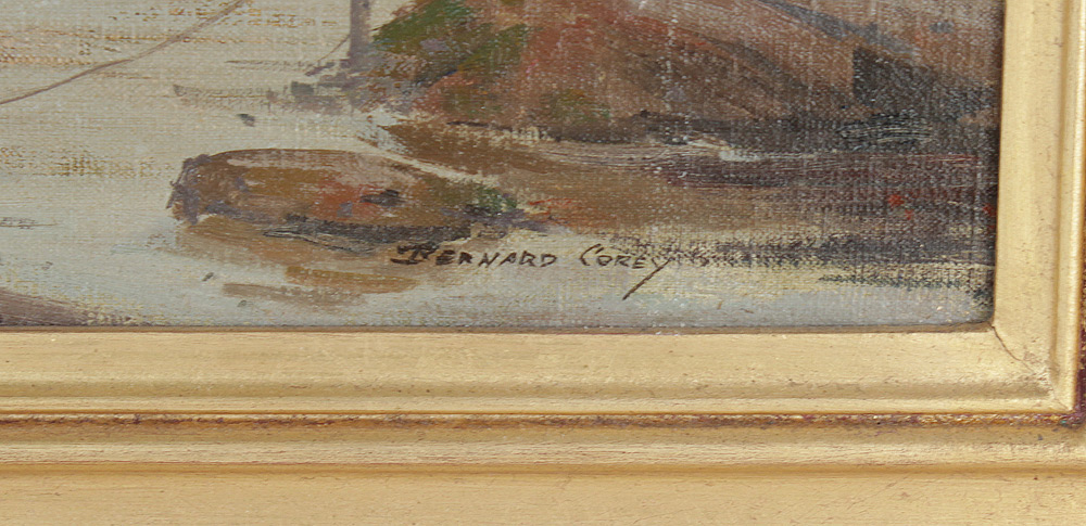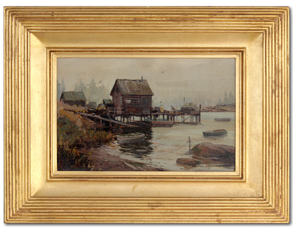 COREY, Bernard, (American, 1914-2000): ''Misty Morning'', River Scene with Dock, Shack, and Fisherman, Oil/Canvasboard, 9'' x 14'', signed lower right, encased in a heavy gilded and carved frame 16 1/2'' x 21 1/2''.