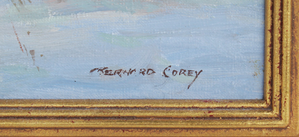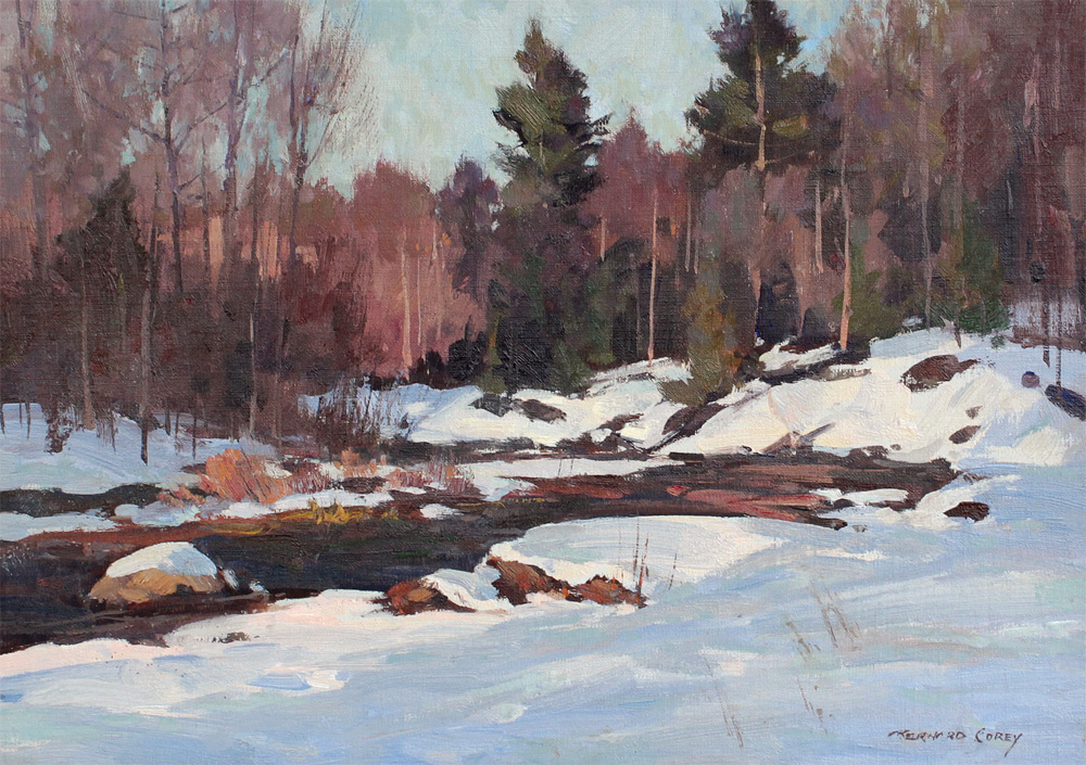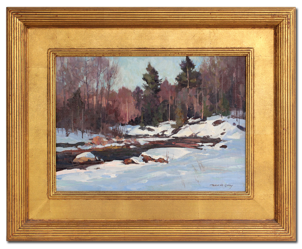 COREY, Bernard, (American, 1914-2000): Winter Stream, Oil/Canvas affixed to Masonite, 10'' x 14'', signed lower right, fine gilded framing 16 3/4'' x 20 3/4''.