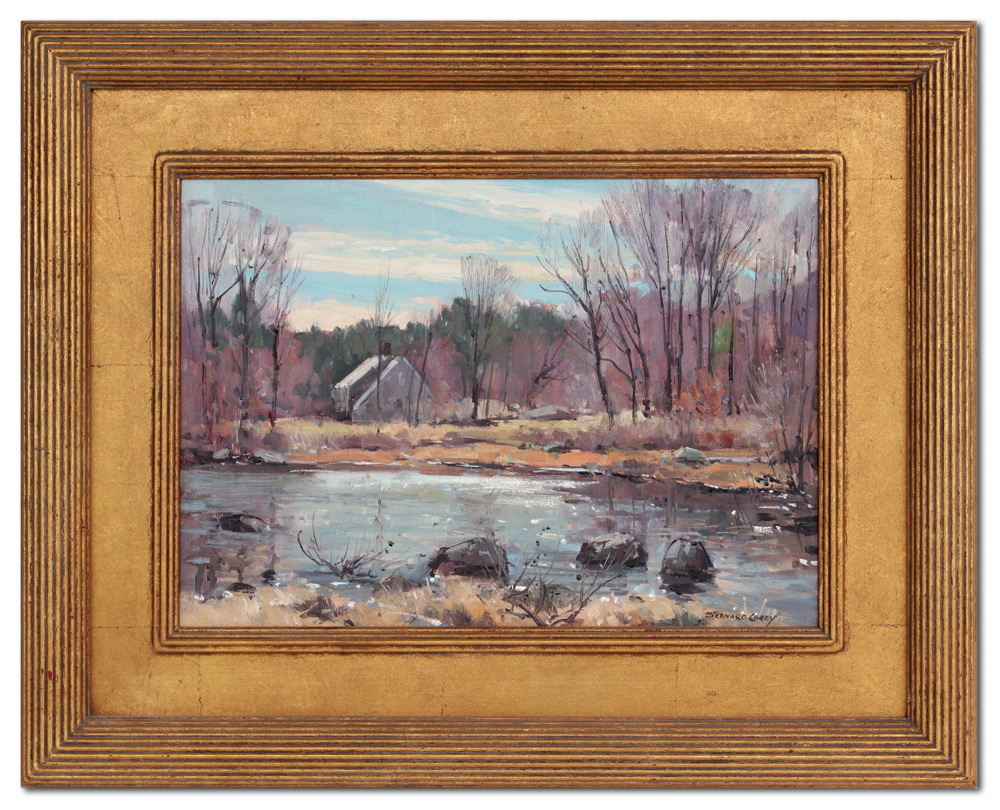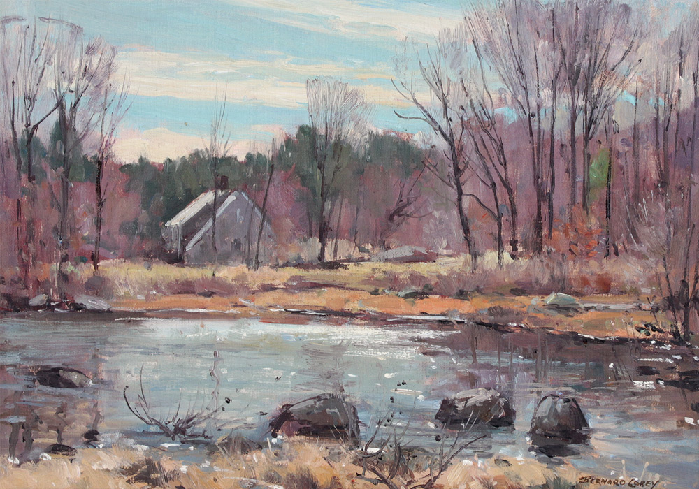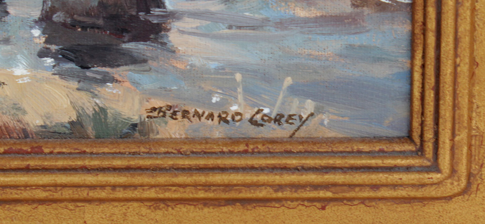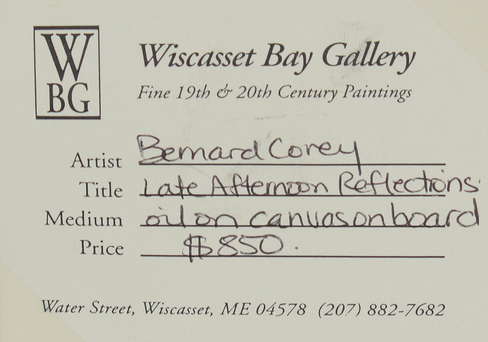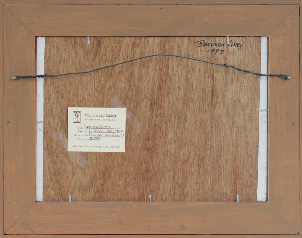COREY, Bernard, (American, 1914-2000): ''Late Afternoon Reflections'', Oil/Canvas on board, 10'' x 14'', signed lower right, encased in custom frame 16 1/4'' x 20 1/2'', Wicasset Bay Gallery label affixed verso, signed verso, dated 1997.