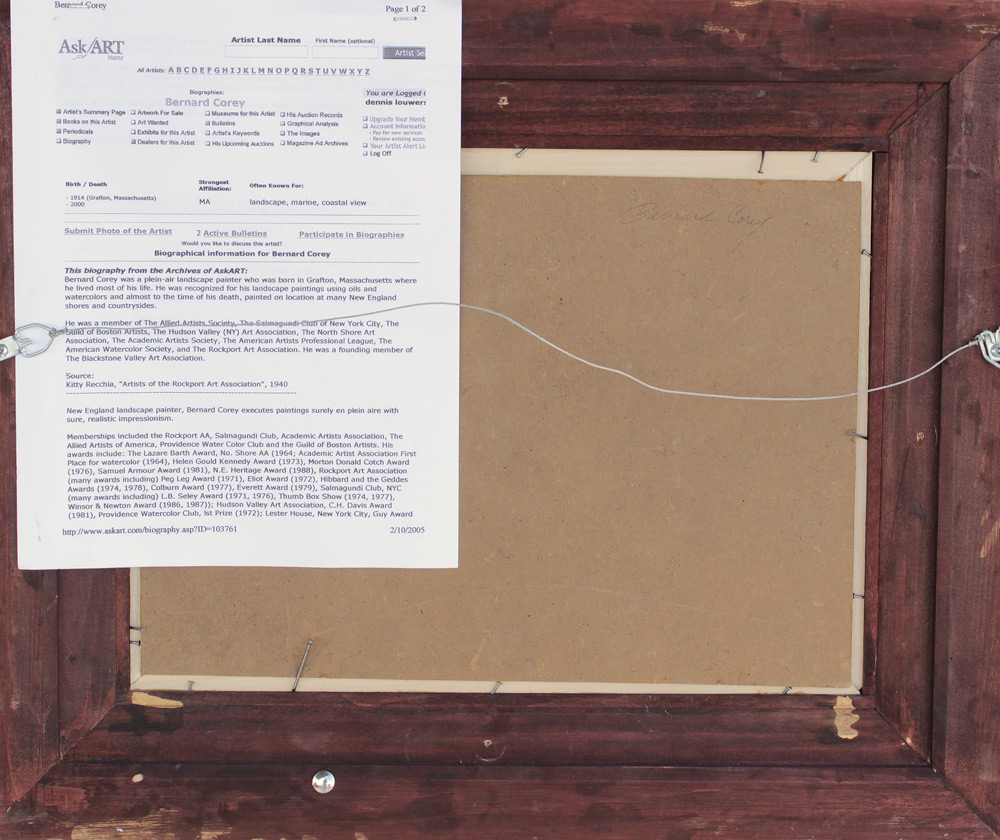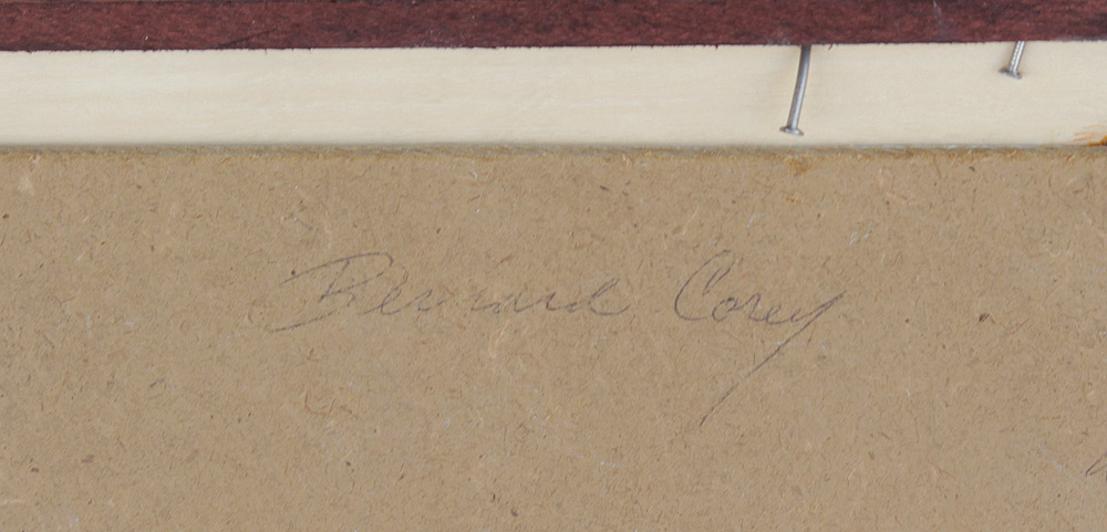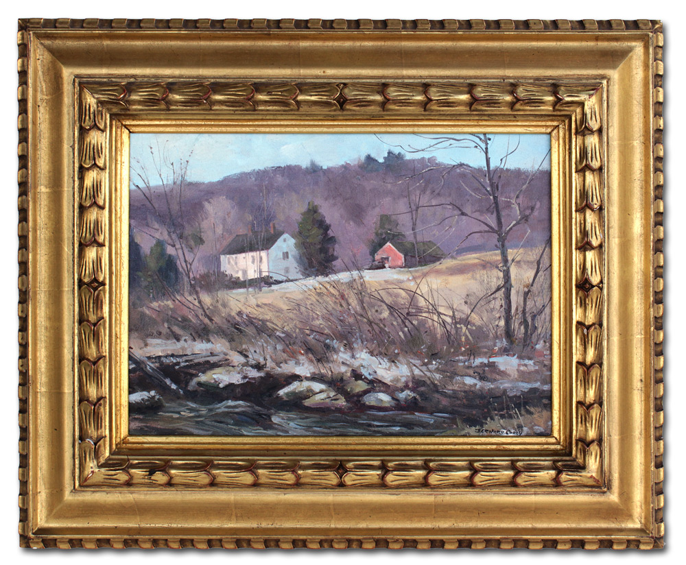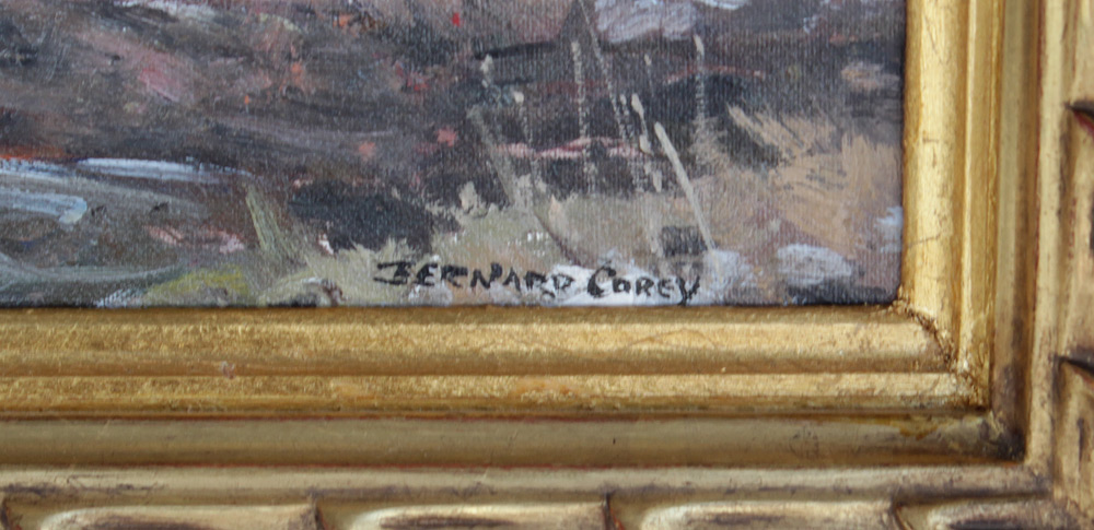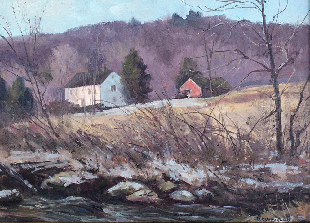 COREY, Bernard, (American, 1914-2000): Northeastern Fall Landscape Painting with Farmhouse & Barn, Oil/Canvasboard 3/4'' x 14'', signed lower right, encased in a carved and gilded frame 16 1/2'' x 20 1/4''.