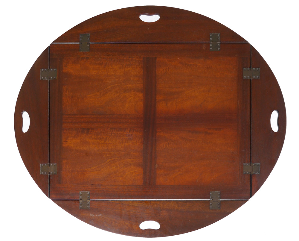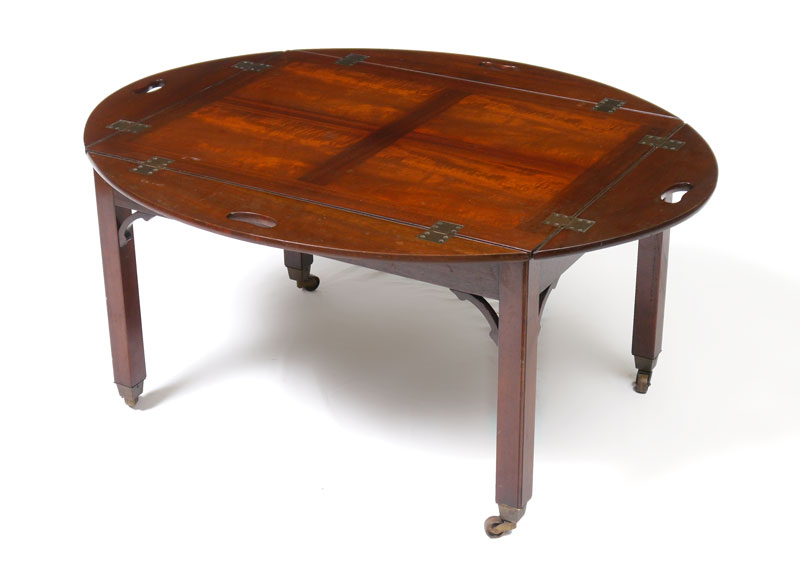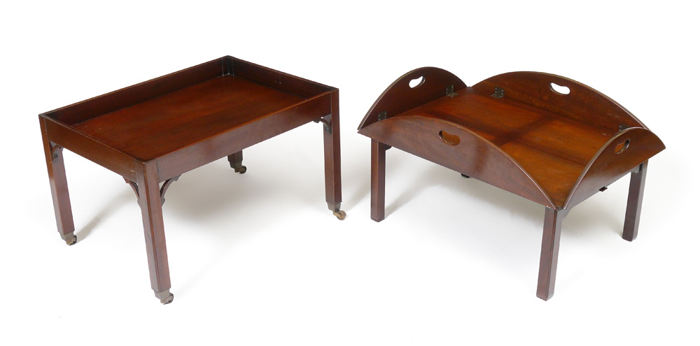 KITTINGER MAHOGANY 2 TIER BUTLERS TRAY SERVING CART: Converts from a single level table on wheels to a serving cart by lifting the top tray and putting the legs down. Marked Kittinger Buffalo. Overall in 2 tier configuration 34 1/4'' h. x 31 1/4'' x 23 1/4''
