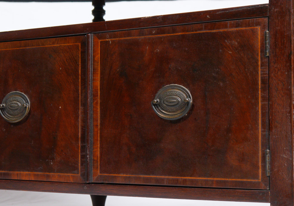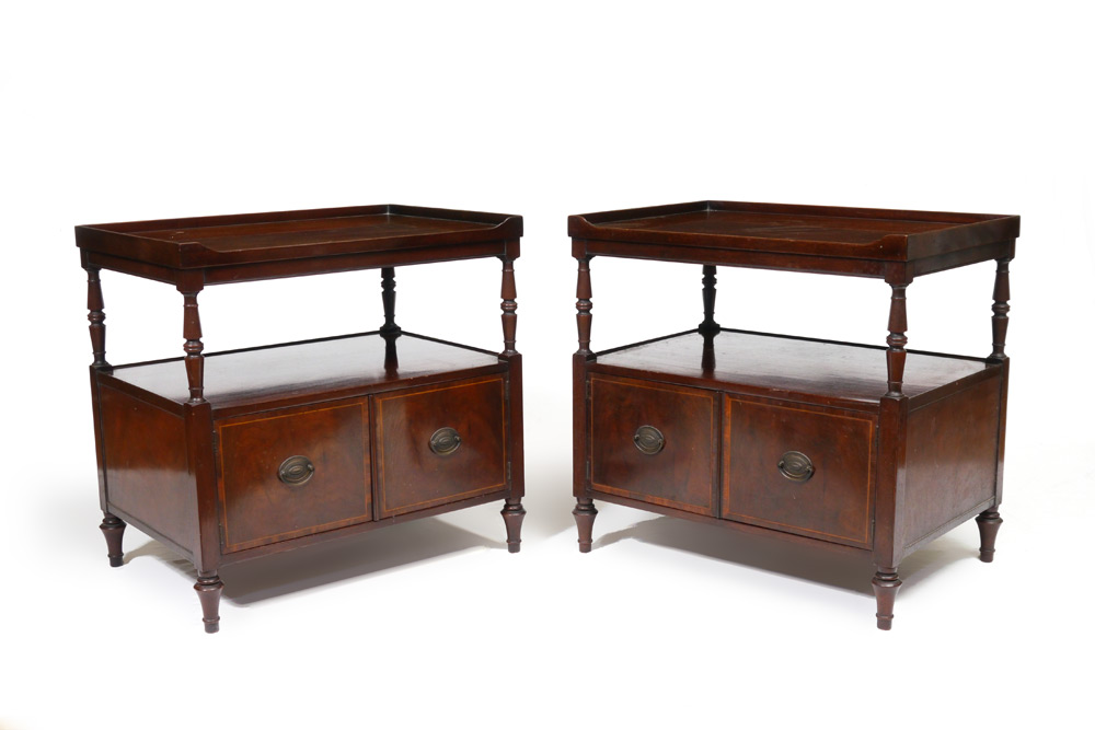 PAIR BAKER FURNITURE MAHOGANY SIDE TABLES: Top with wood gallery over open shelf with turned supports over 2 doors with string inlay. Turned feet. Brass Baker nameplate. 25 1/4'' h. x 26'' x 18''.