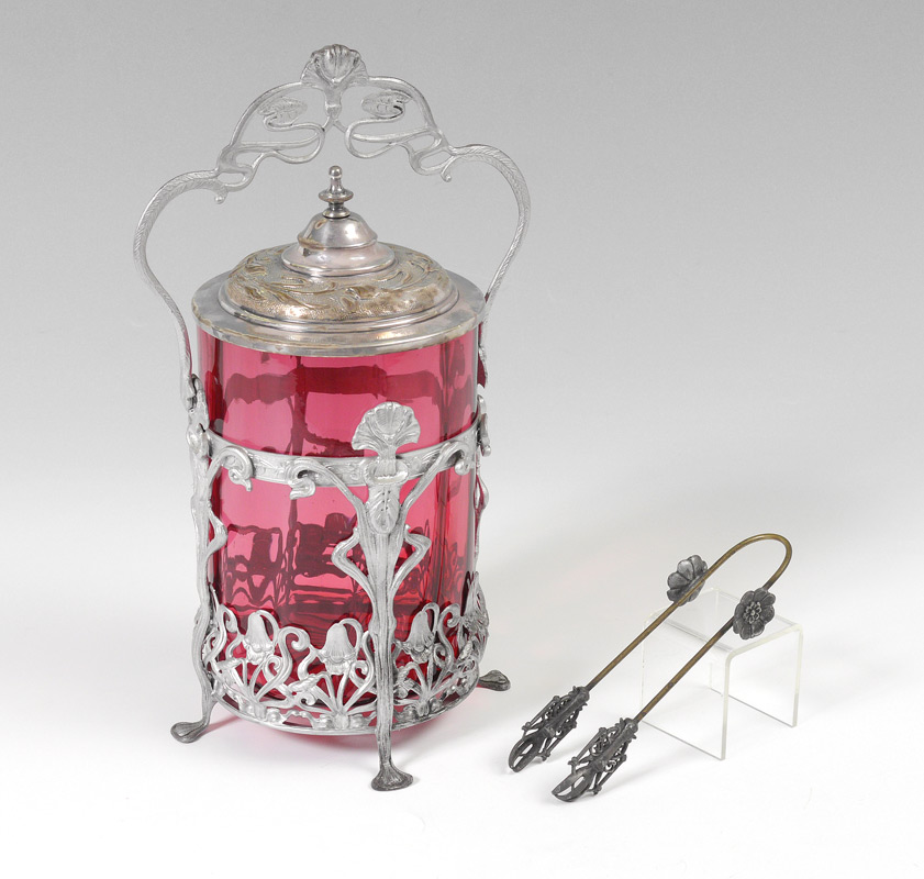 CRANBERRY GLASS PICKLE CASTOR: Art nouveau motif silverplate footed stand with fluted cranberry glass insert. Replacement lid, sold with mixed metal pickle tongs. Overall measures 9 1/2'' h. x 6 1/2''.