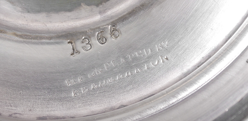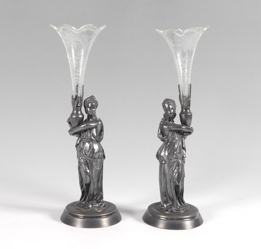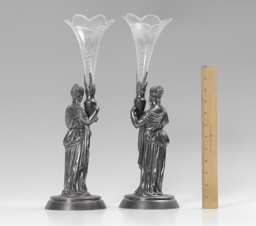 PAIR REED & BARTON SILVERPLATE FIGURAL VASES: Silverplate bases with figures of neo-classical maidens holding urns, etched glass vase inserts. Marked on base ''MF'D & PLATED BY REED & BARTON, 01385''. Overall with inserts, 16 1/2'' x 5 1/2''.