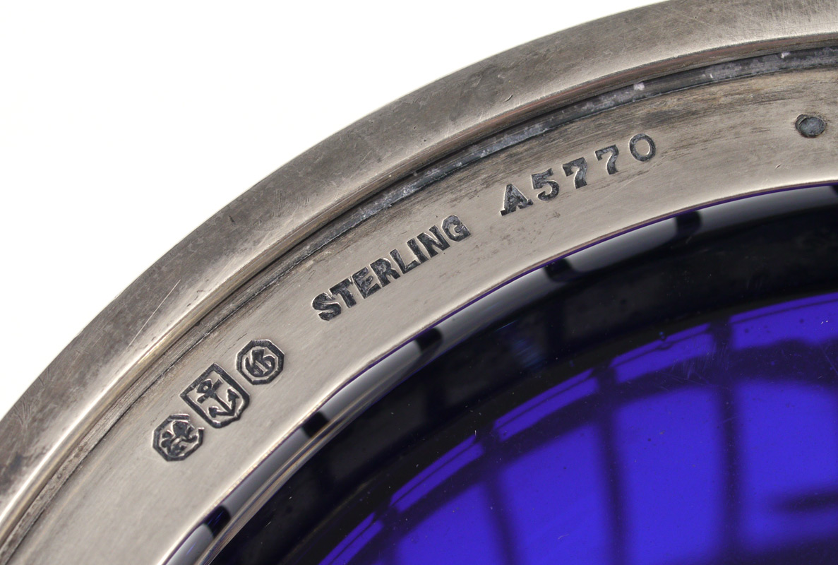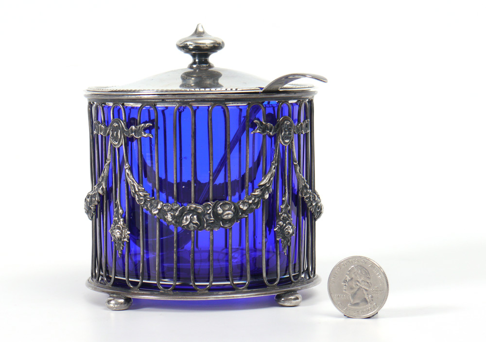 STERLING CONDIMENT JAR WITH BLUE GLASS INSERT: Gorham sterling stand with embossed floral swags, on 4 ball feet, cobalt blue glass insert. Sterling lid inscribed ''A souvenir for Hugh Michael Bland from E. V. Millington Drake, 1908''. Sold with Gorham sterling serving spoon. 4 3/4'' h. x 4'' dia. 8.0 troy oz without insert.