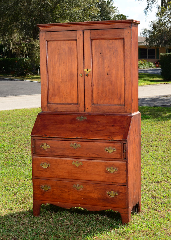 AMERICAN SECRETARY BOOKCASE: 2 part, pegged construction. Top with 2 doors, 2 internal shelves lined with contact paper. Base with fall front secretary, internal drawers and pigeon holes with shaped galleries. 3 graduated full length drawers. Overall 73 3/4'' h. x 37 1/2'' x 18''.