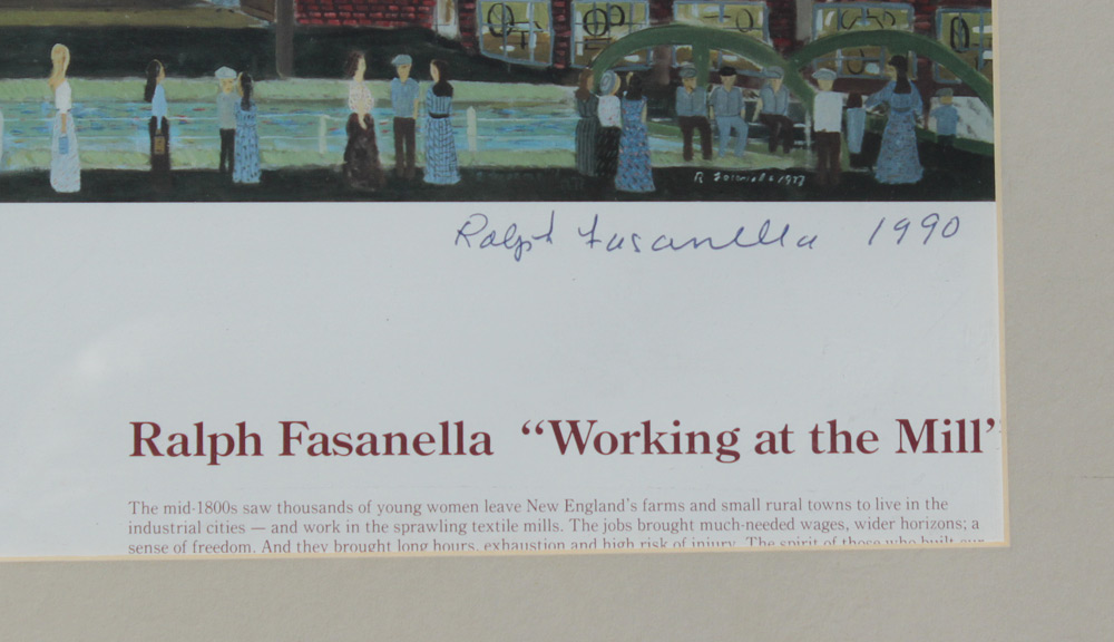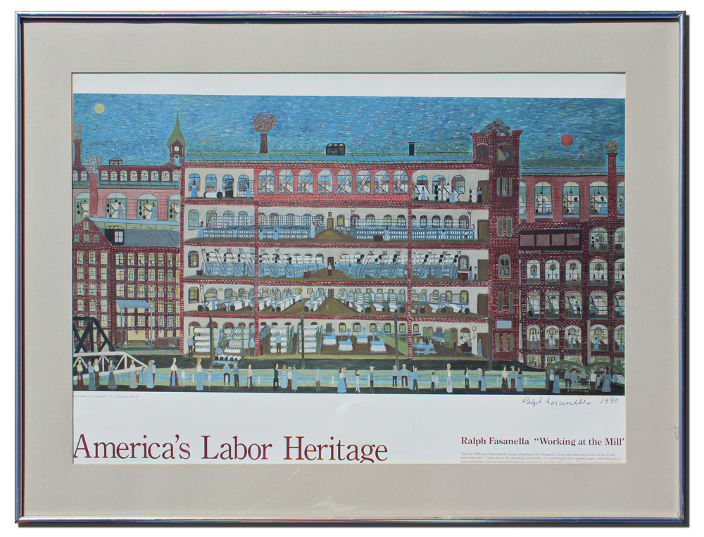 FASANELLA, Ralph, (American, 1914-1997: ''Working at the Mill'', Offset Lithograph, For America's Labor Heritage, Sight size 17'' x 24 1/2'', signed lower right, dated 1990, encased in a chrome frame 22 1/4'' x 30 1/4''.