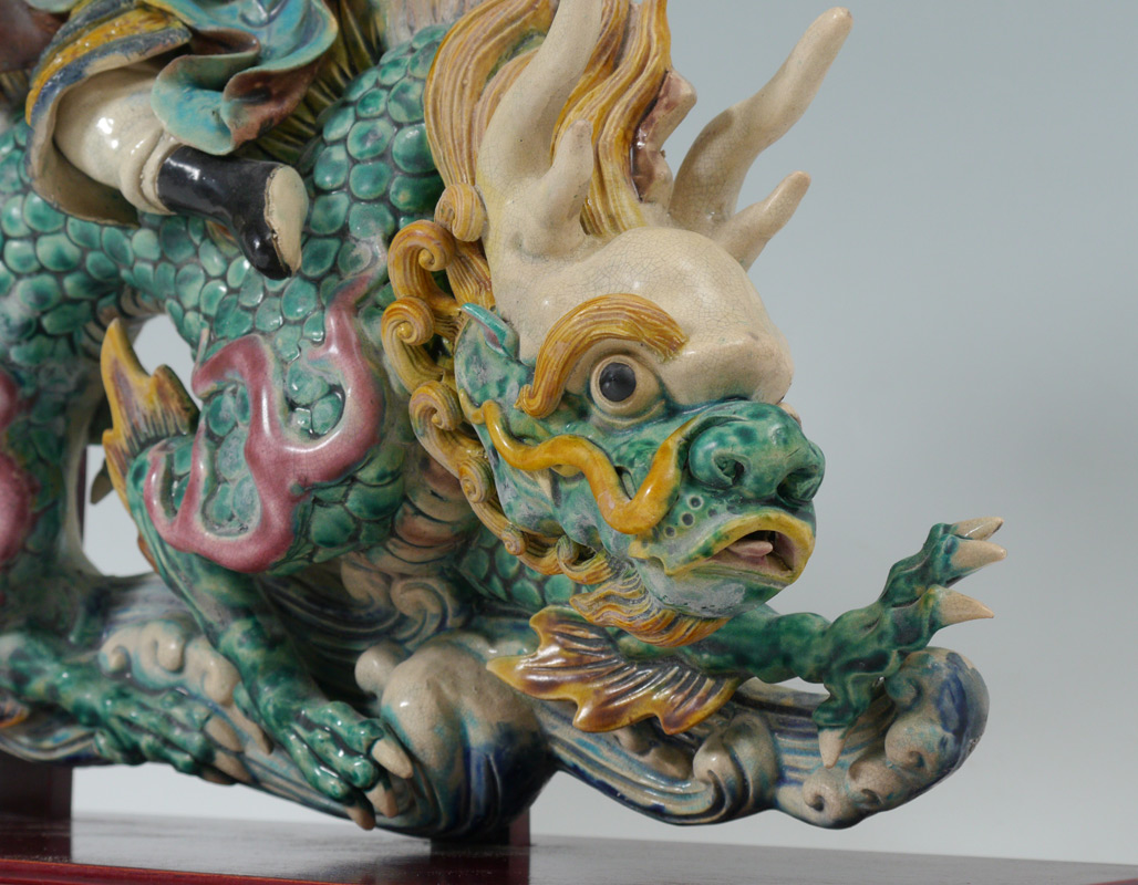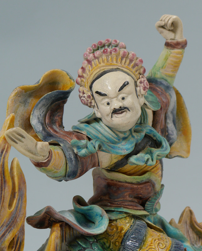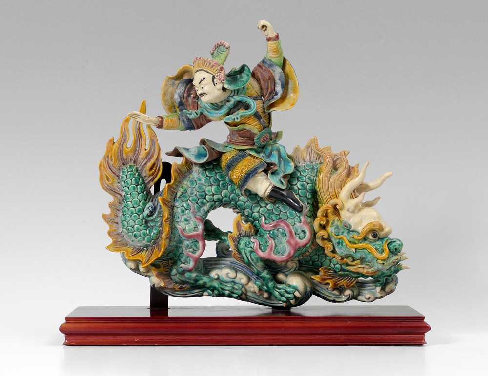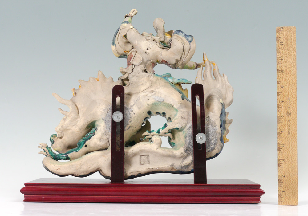CHINESE FIGURAL ROOF TILE: Polychrome decorated figure of a warrior riding a dragon, 13''h. x 13 3/4'' x 4''. Affixed to wood base 14 1/2'' h. x 16 3/8'' h. x 6''.