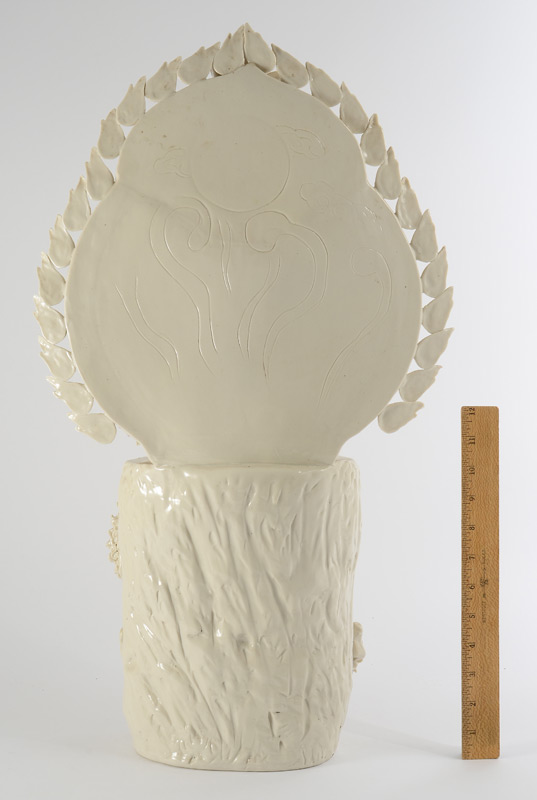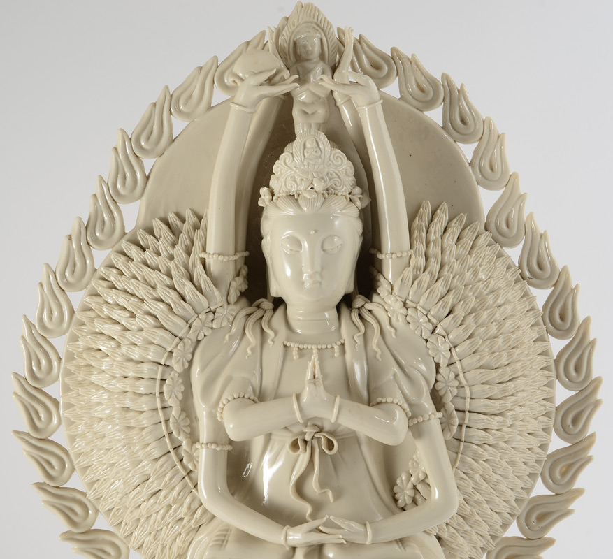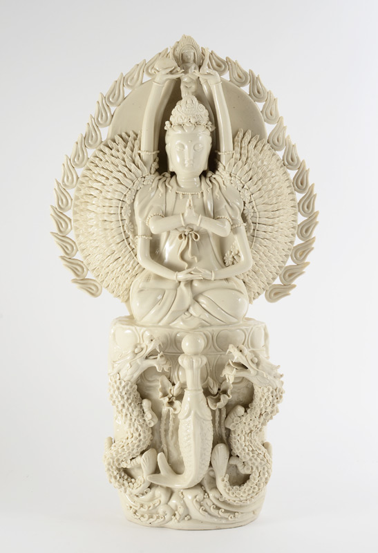 BLANC DE CHINE BUDDHIST GODDESS FIGURE: Earthenware figure of a Buddhist goddess bearing 8 arms, seated in a lotus position on a wall with 2 dragons below. Overall measures 24 3/4'' h. x 13 3/4'' x 6''. Actual age unknown.