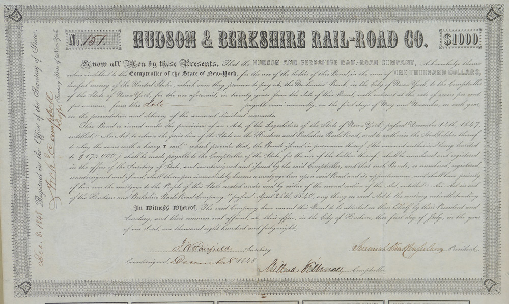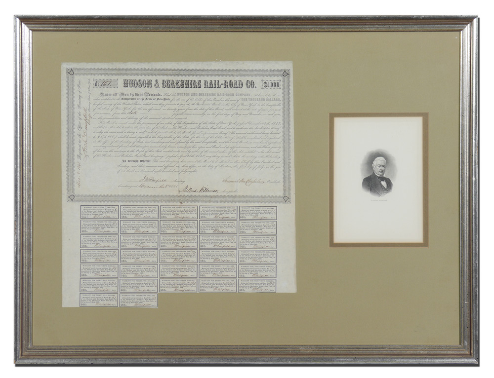 1848 MILLARD FILLMORE SIGNED RAILROAD BOND: Hudson & Berkshire Rail-Road Co. $1000 bond dated 1848, signed by future 13th President of the United States, Millard Fillmore. 3 $35 coupons have been removed. Sight size 14 1/2'' x 14'', framed 20 5/8'' x 27 5/8''.