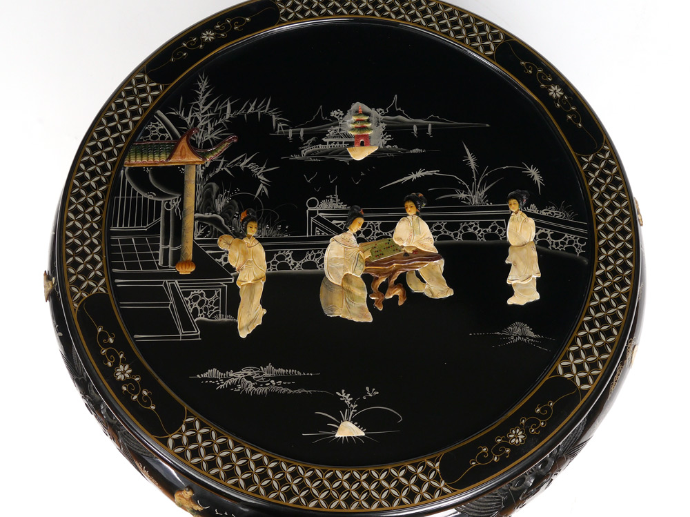 STONE INLAY CHOW TABLE & 4 CHAIRS: Table with paint and applied stone decoration of outdoor genre scene, glass top, 20 3/4'' h. x 32''. 4 chairs slide under table, 13'' h. x 17'' x 12 1/2''.
