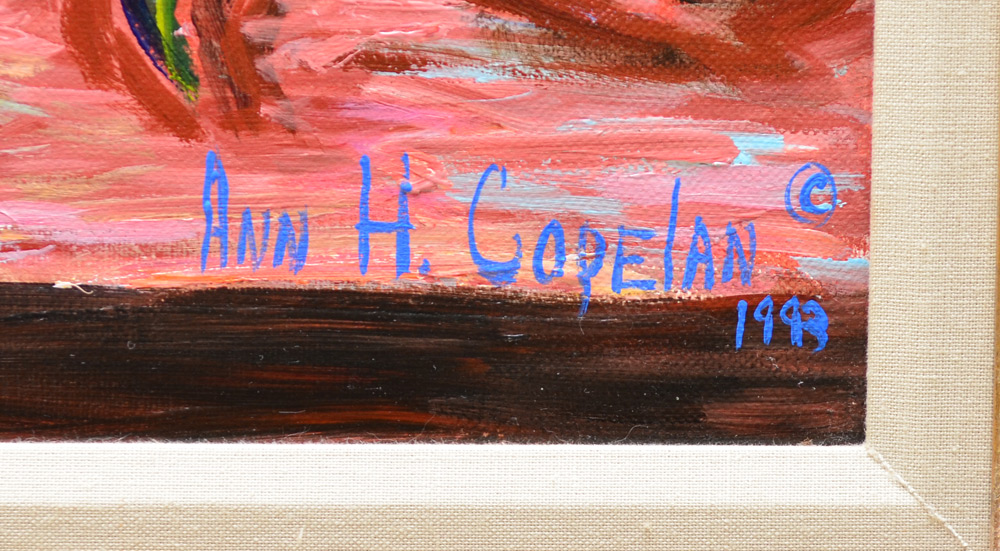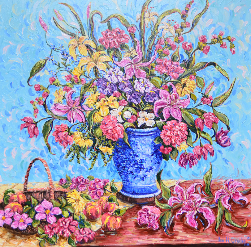 COPELAN, Ann, (American, 20th Century): Flower Arrangement in a Blue Vase, Oil/Canvas, 40'' x 40'', signed lower right Ann H Copelan, dated 1983, encased in original antiqued frame with foliate motif 50'' x 50''.