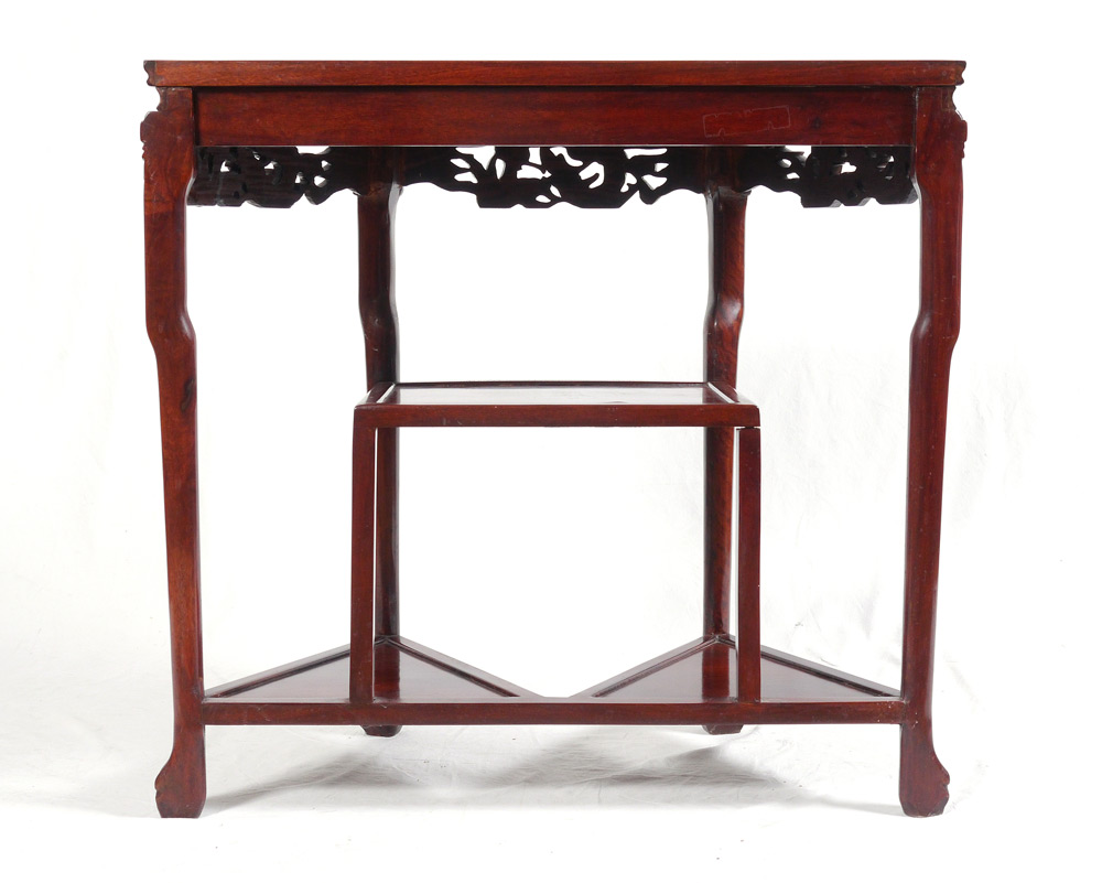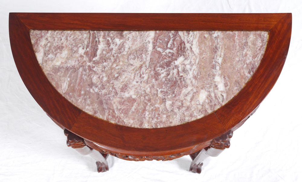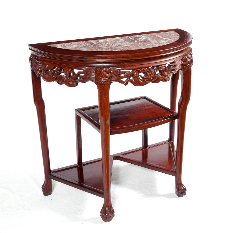 ORIENTAL DEMILUNE DISPLAY STAND / HALL TABLE: Demilune top with insert marble, carved and pierced apron, shaped legs ending in paw feet supporting 3 display shelves. 31 1/2'' h. x 33 1/4'' x 17''.