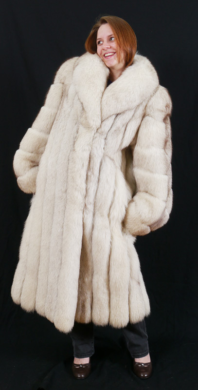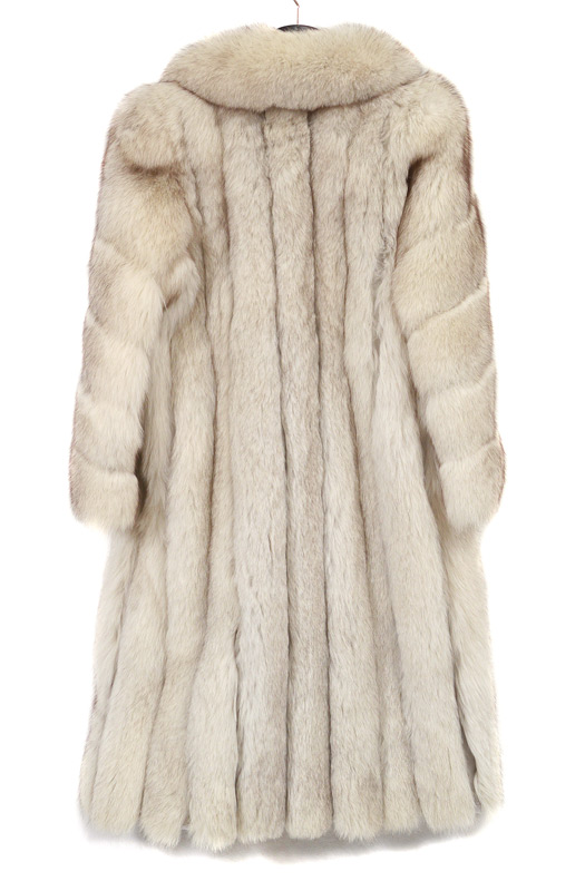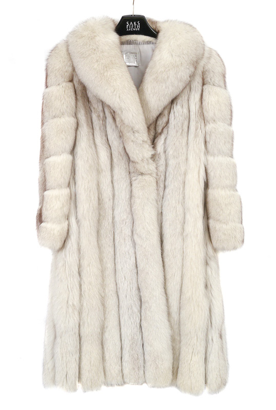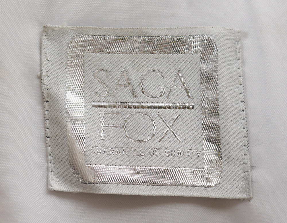 SAGA SILVER FOX FUR COAT: Fully lined with leather trim at cuffs and pockets, approximate size XL, shoulders approx. 20'', 52''l.