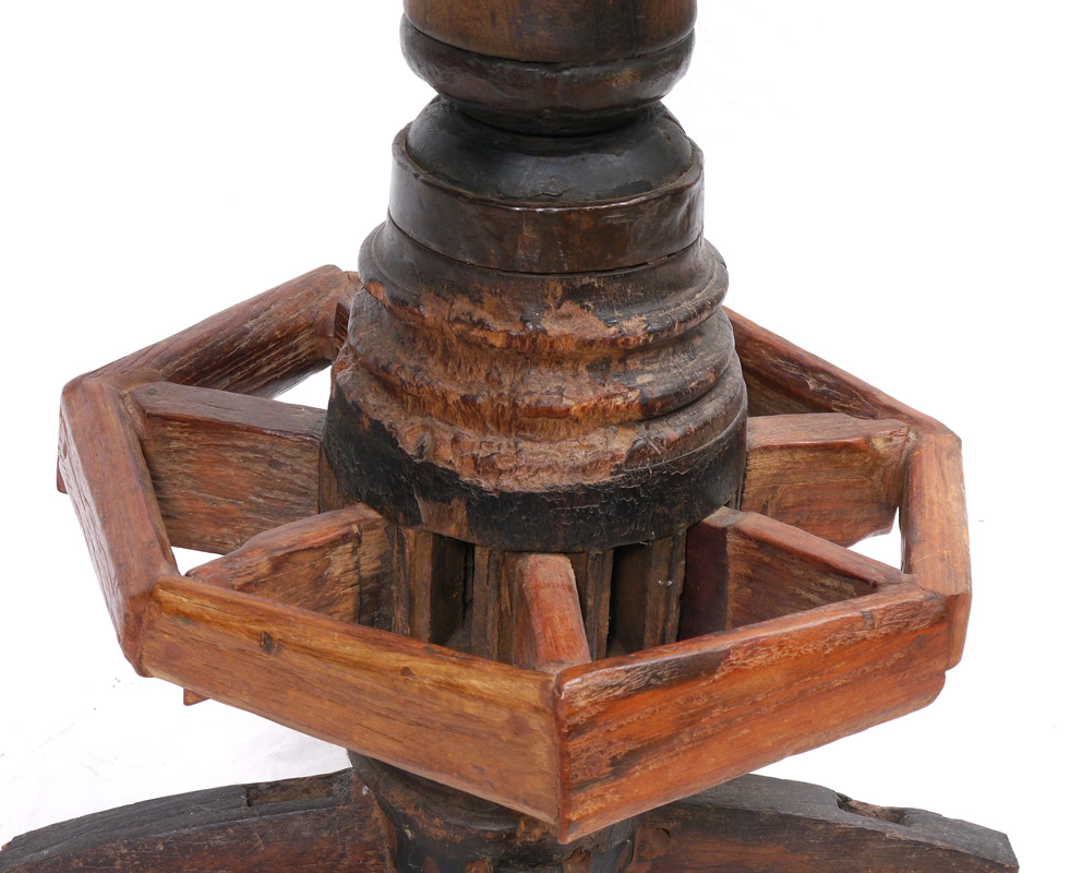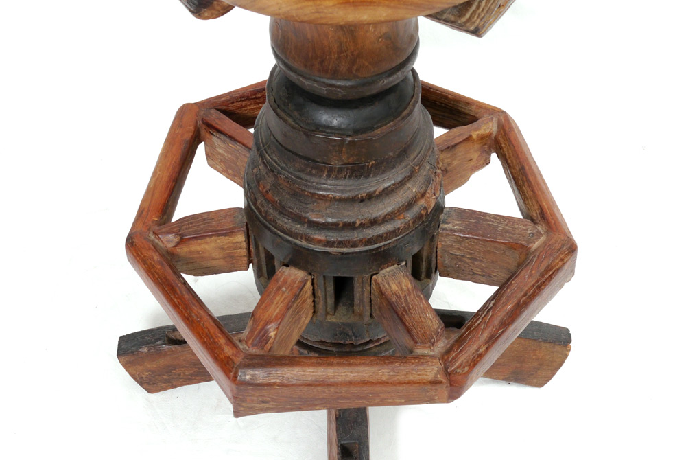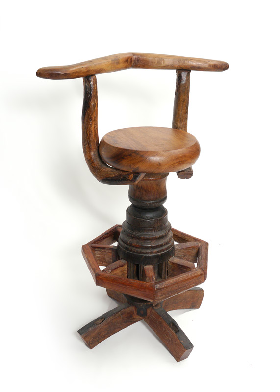 WESTERN THEME BAR STOOL: Carved yoke top rail, shaped supports, chair swivels. Turned pedestal with wagon spoke decoration, 4 legs. Overall measures 40 3/4'' h. x 22''
