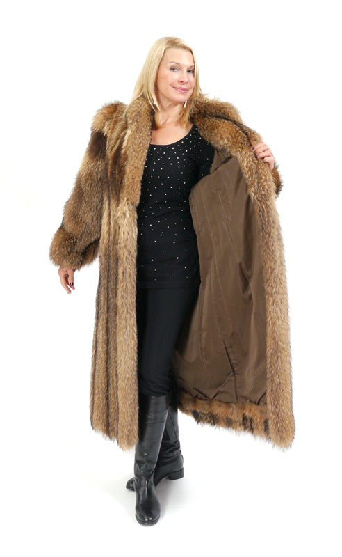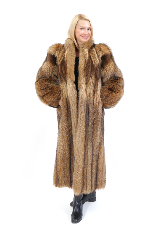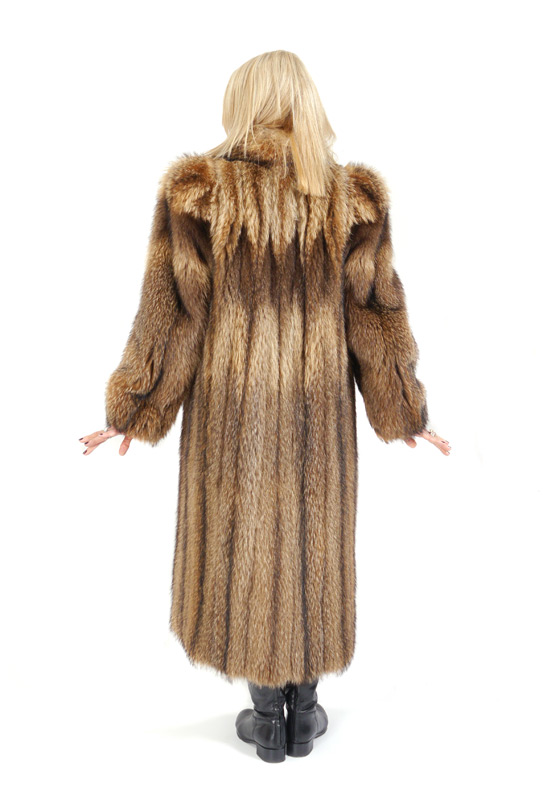 TANUKI ASIATIC RACCOON FULL LENGTH FUR COAT: Fully lined, approx. measurements are - sleeve shoulder to cuff 27'', across shoulders 20'', collar seam to hem 48''.