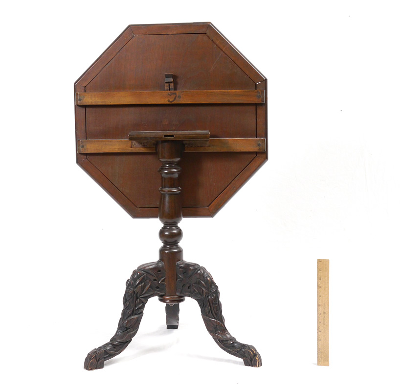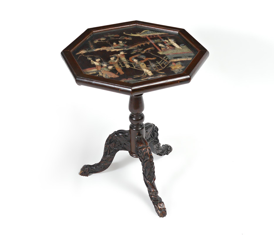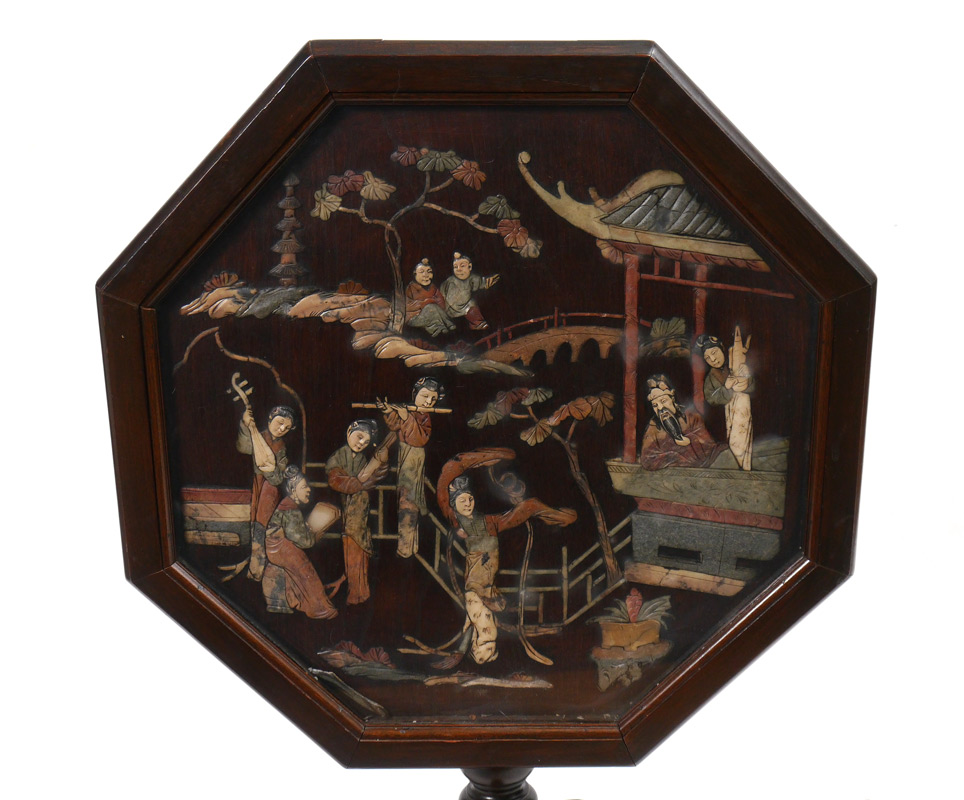 ORIENTAL INLAID STONE TILT TOP SIDE TABLE: Octagonal glass top over inset stone decoration with oriental outdoor genre motif. Turned pedestal over 3 carved splayed legs. 27 1/2'' h. x 23 1/2''.