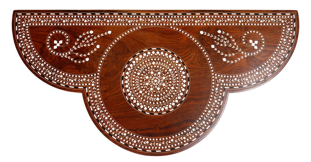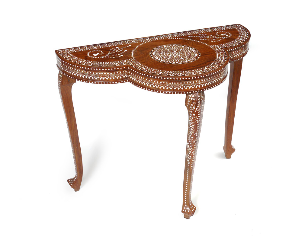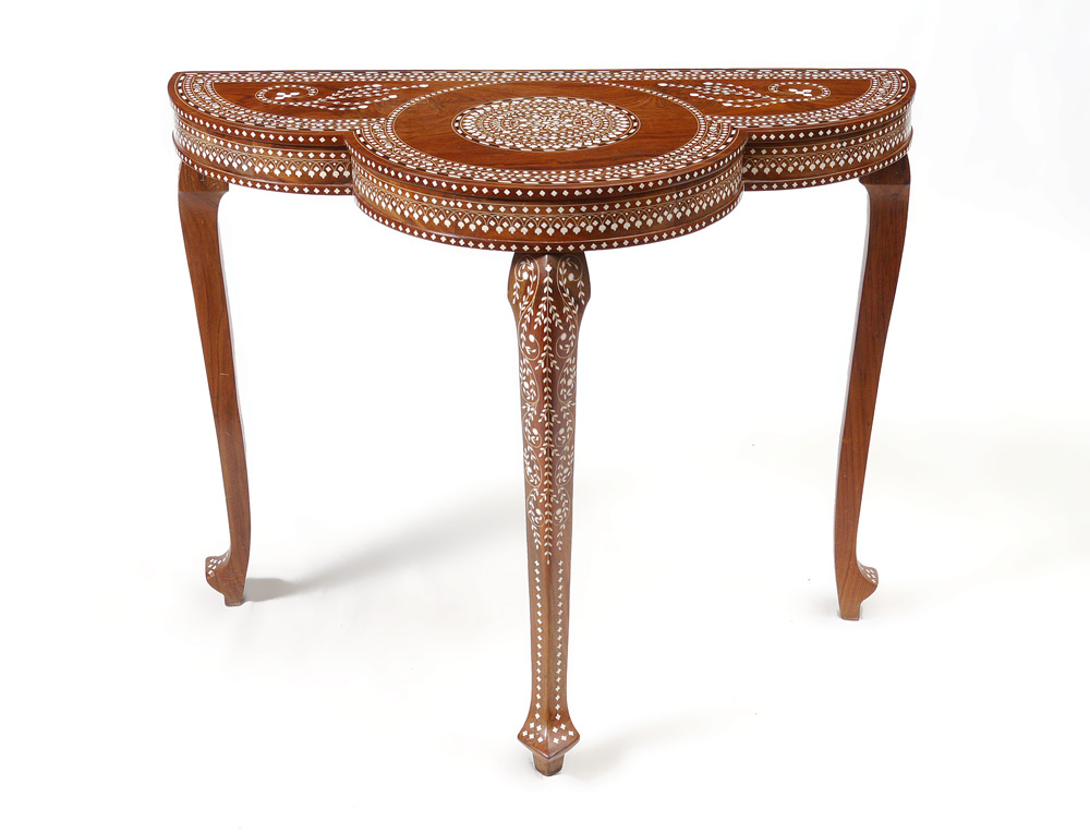 INTRICATE BONE INLAID DEMILUNE TABLE: Profusely inlaid with geometric and floral motifs. Shaped top, skirt and legs. Made in India. 30'' h. x 36'' x 18''.