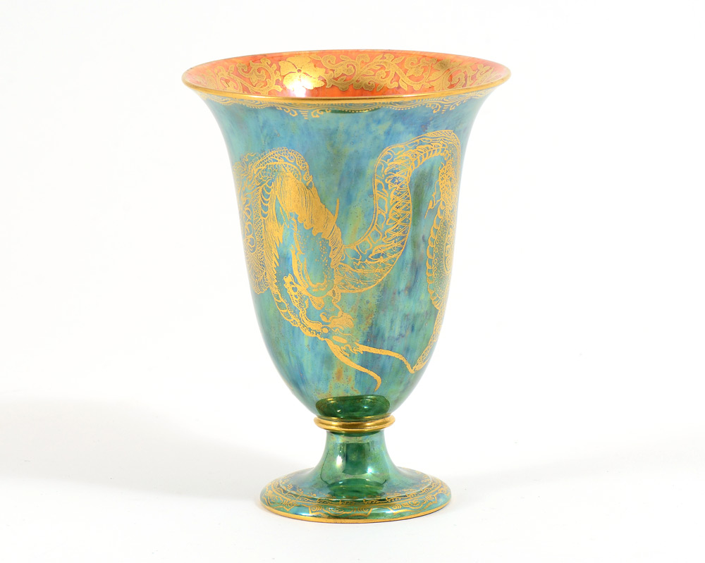 WEDGWOOD DRAGON MOTIF LUSTER VASE: Gilt dragon and butterfly decoration over green luster. 5 3/8'' h. x 4''.