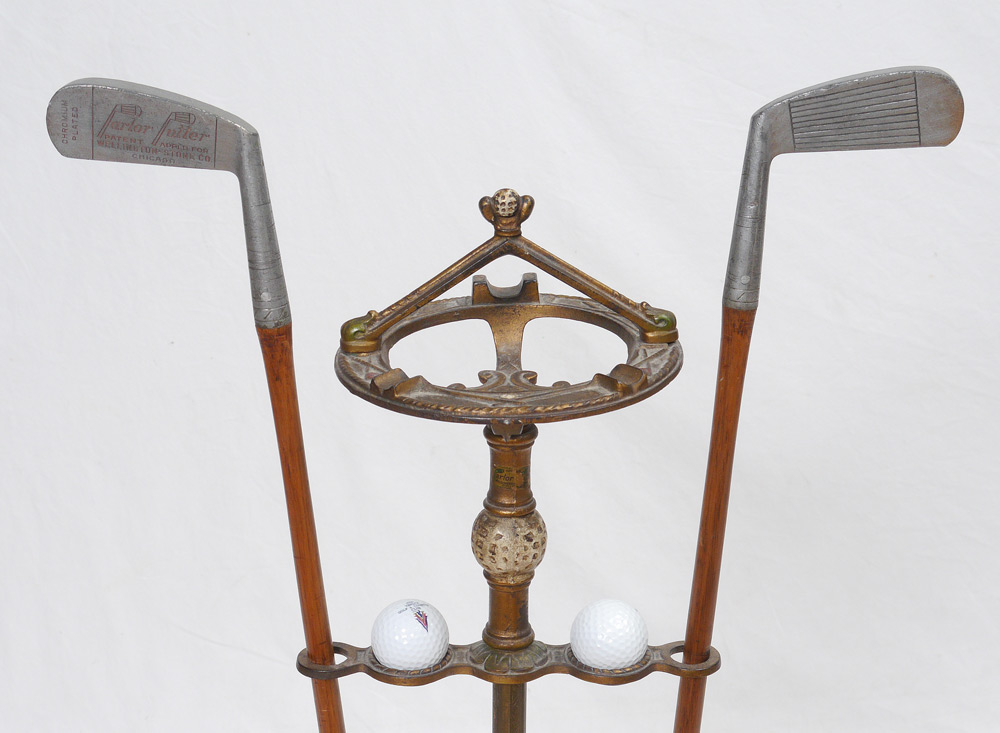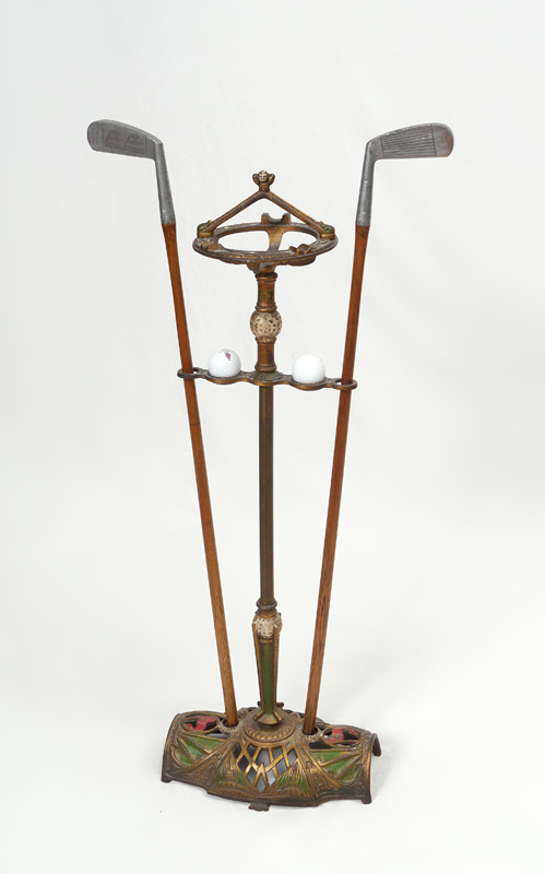 WELLINGTON STONE ''PARLOR PUTTER'' SMOKING STAND: Circa 1920's, paint decorated cast iron ashtray and base with gold motifs. 2 ''Parlor Putter'' putters marked Wellington-Stone Co. Chicago. Overall stand measures 34 1/2'' h. x 12'' x 7''.
