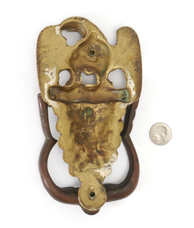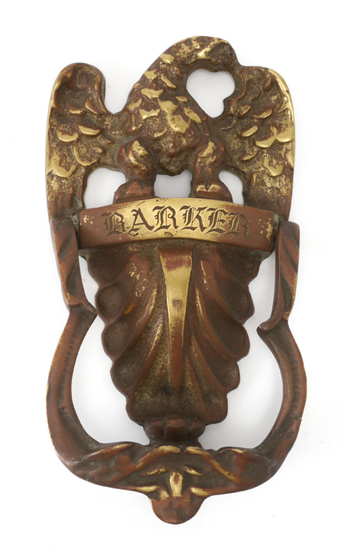 FIGURAL EAGLE BRONZE KNOCKER: Figural eagle over banner engraved ''Barker''. Measures 8'' h. x 4 1/4'' x 1 3/4''.